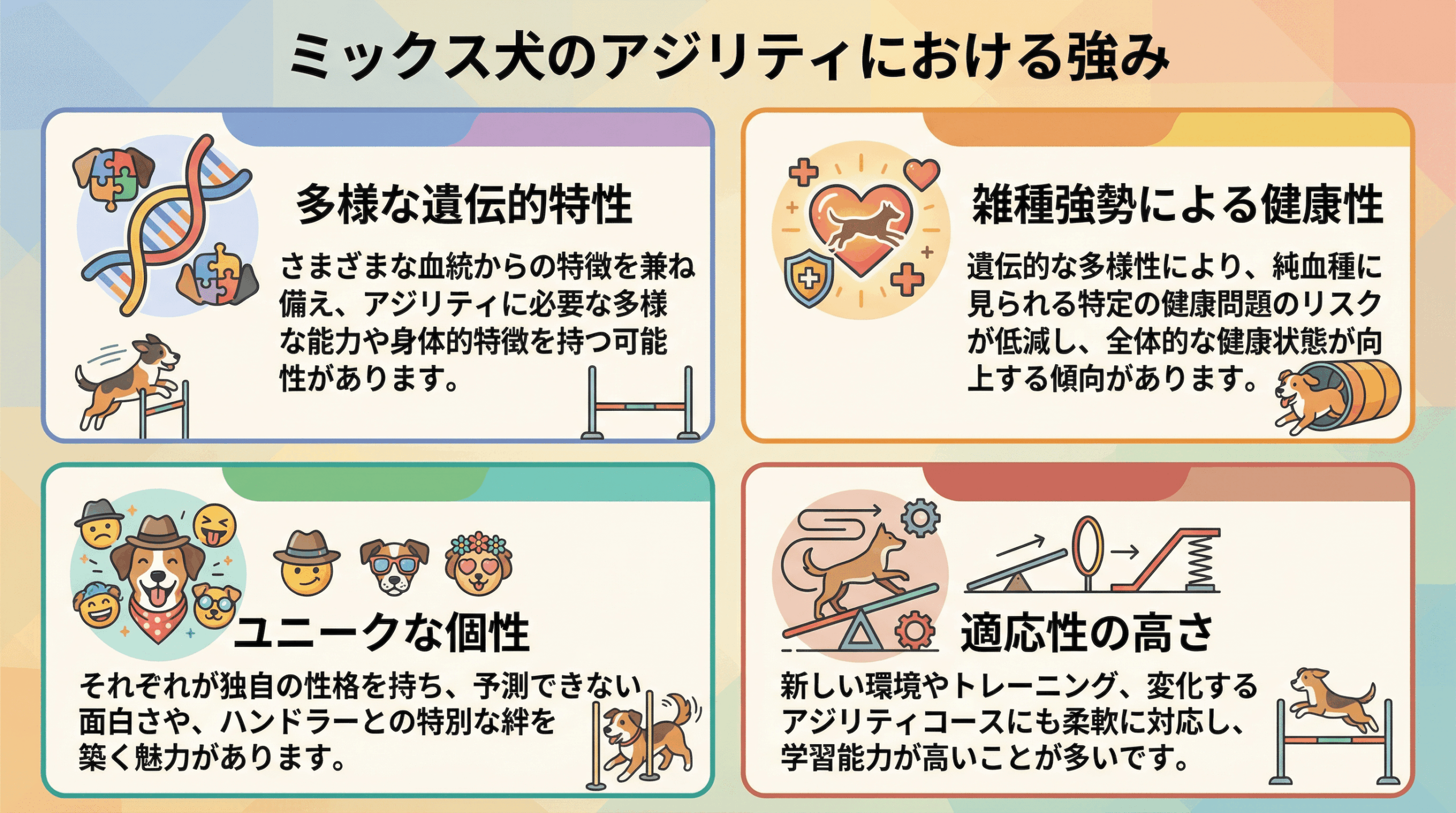 •多様な遺伝的特性: さまざまな犬種の血が混ざり合うことで、ある犬種のスピードと、別の犬種の賢さといった、アジリティに有利な特性を偶然にも兼ね備えていることがあります。