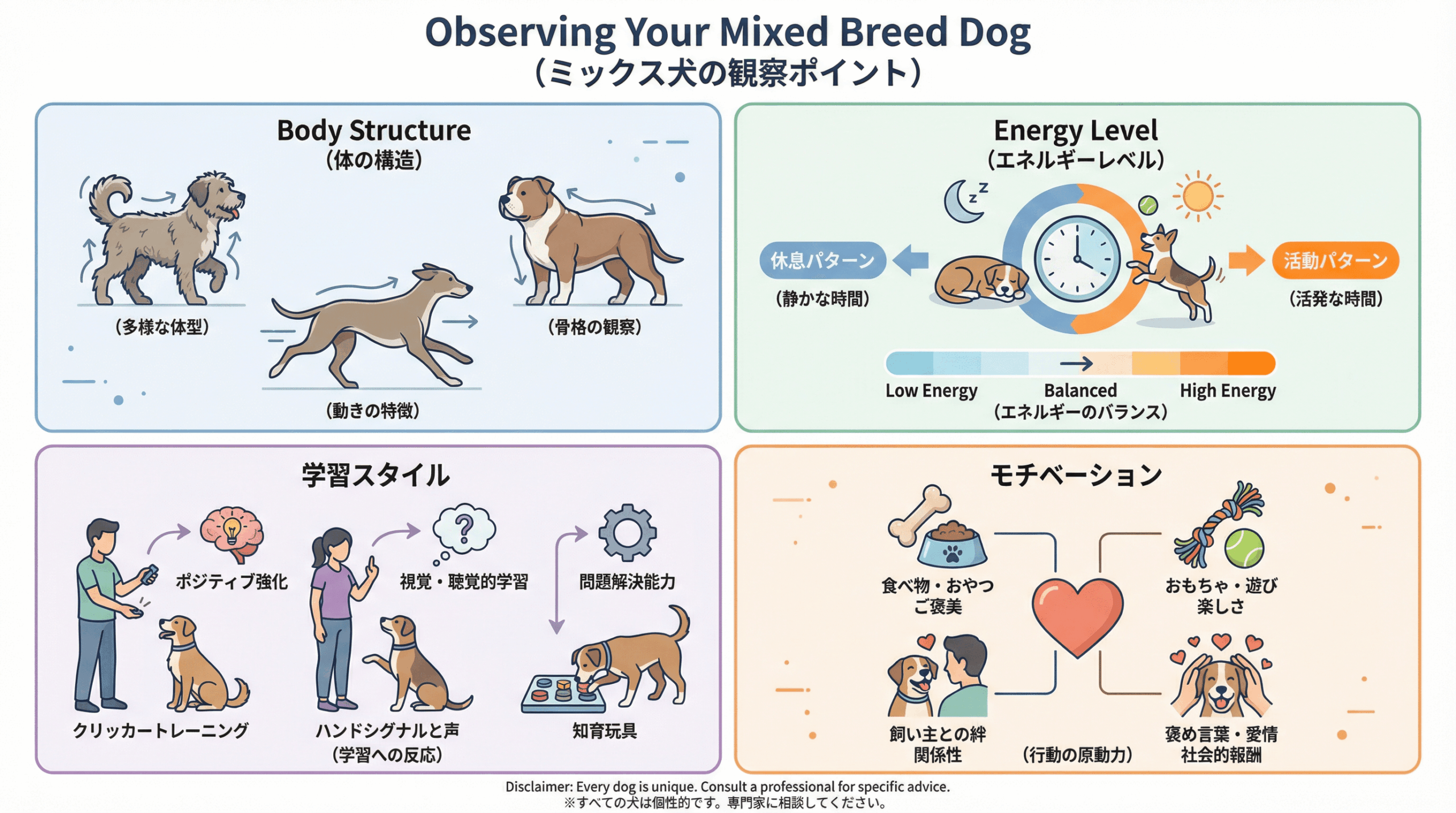 ミックス犬のトレーニングは、犬種という先入観を捨て、白紙の状態で目の前の犬を観察することから始まります。愛犬は、あなただけの「犬種」なのです 。