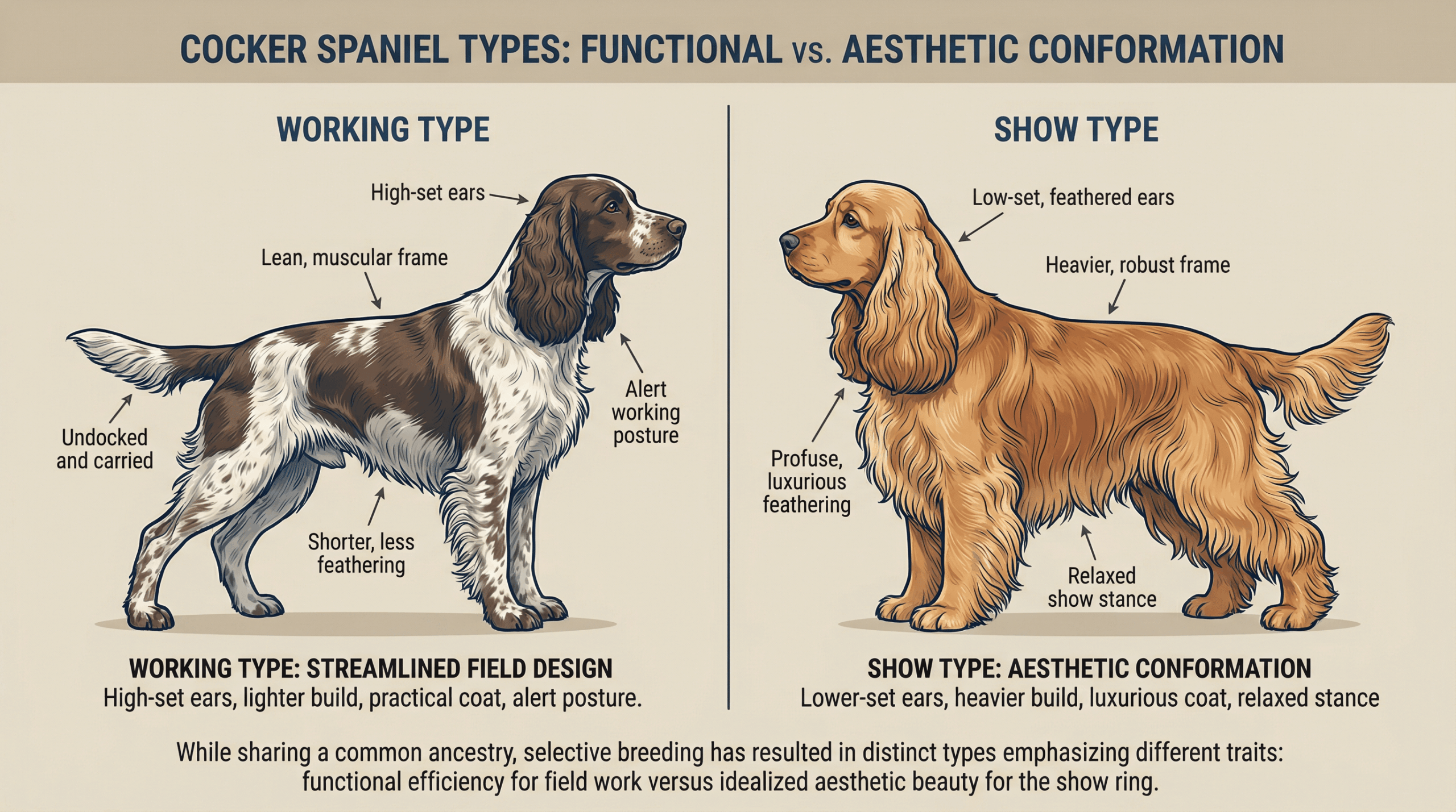 ワーキングコッカーとショーコッカーは、同じイングリッシュ·コッカー·スパニエルという⽝種でありながら、その外⾒と特性には顕著な違いが⾒られます。これらの違いは、それぞれの系統が追求してきた⽬的の違いを明確に反映しています。