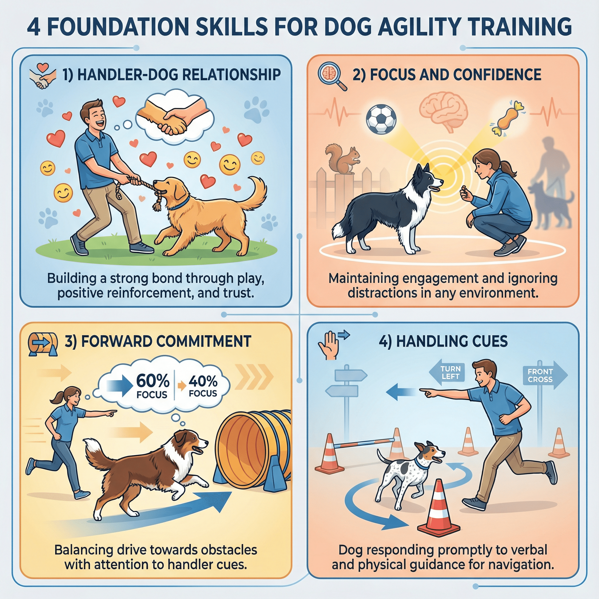 ⾼度な障害物トレーニングに⼊る前に、強固な⼟台を築くことが成功への最短距離です。専⾨家は、特に以下の4つの基本的なスキルが重要であると指摘しています [3]。