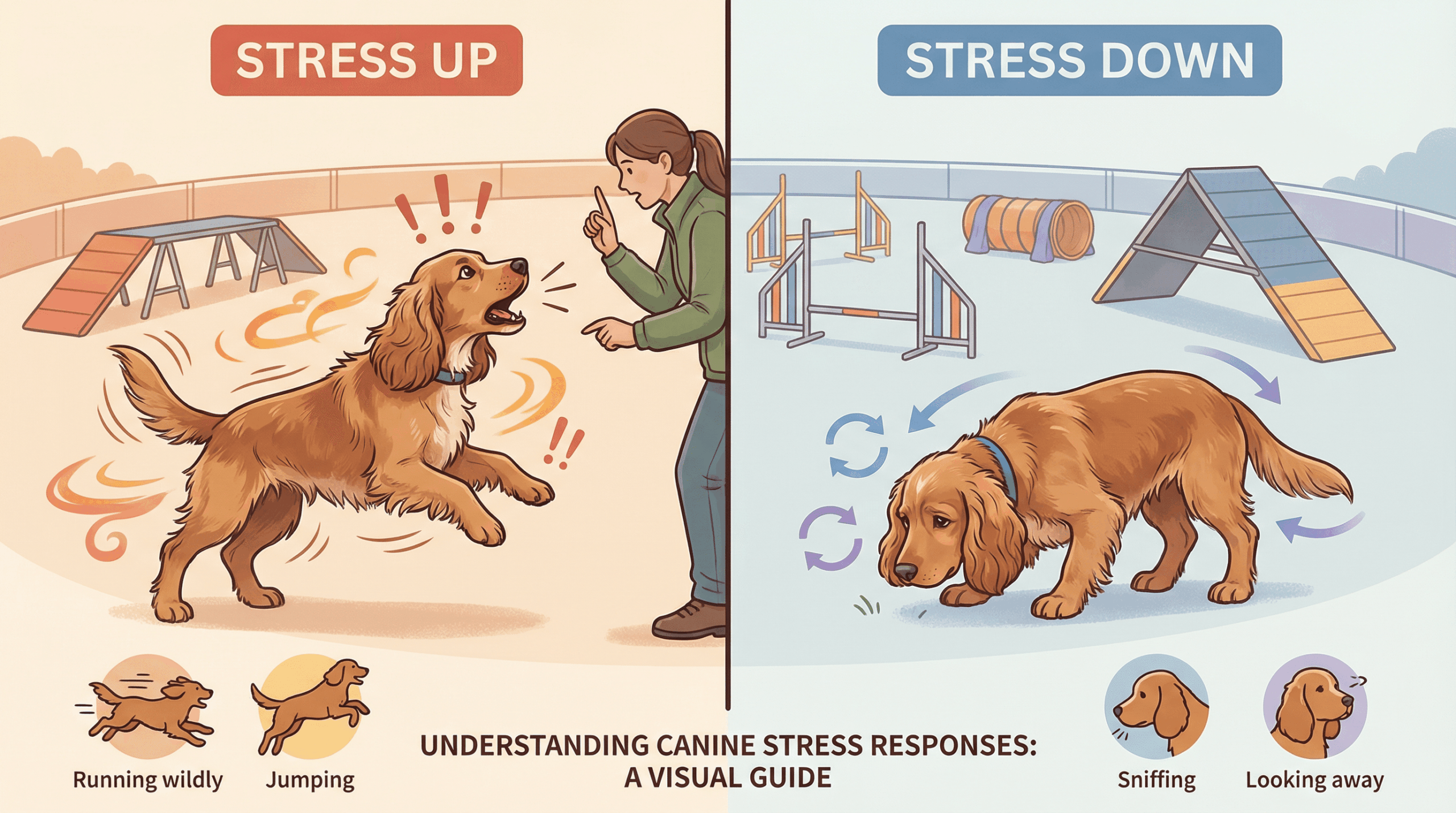 アジリティ競技において、多くのハンドラーが直⾯する最も深刻な問題の⼀つが「リングストレス」です。練習では完璧にできるのに、本番のリングに⼊った途端、⽝が普段のパフォーマンスを発揮できなくなる現象を指します。これは、ワーキングコッカースパニエルのような繊細な⽝種で特に顕著に⾒られます。
