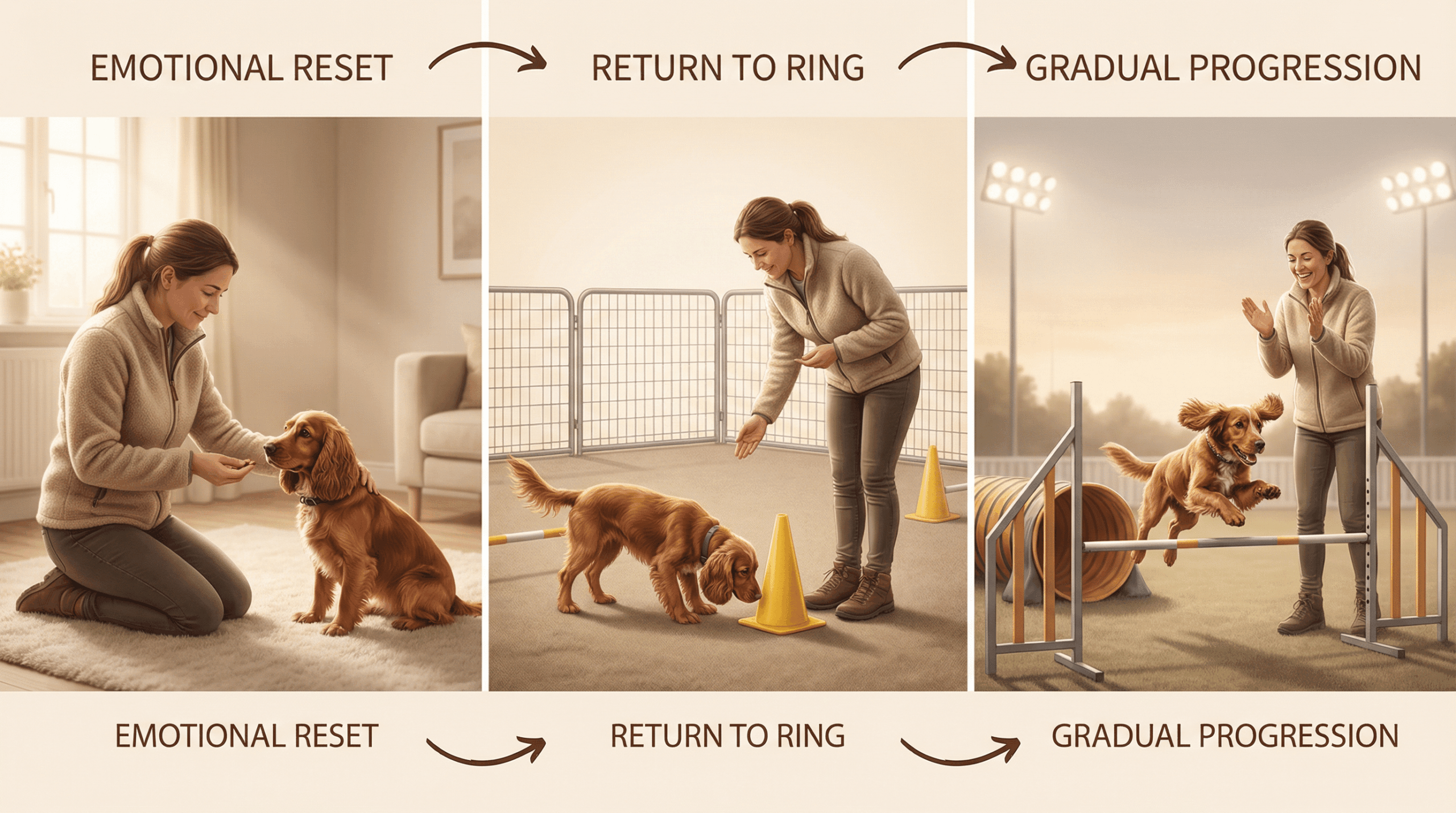 この段階で重要なのは、ハンドラーが「完璧さ」を求めないことです。ワーキングコッカーのような完璧主義的な⽝種は、ハンドラーの期待の⾼さを敏感に感じ取ります。むしろ、「楽しむこと」「参加すること」を最優先とする姿勢を⽰すことが、彼らの⾃信回復の鍵となります。