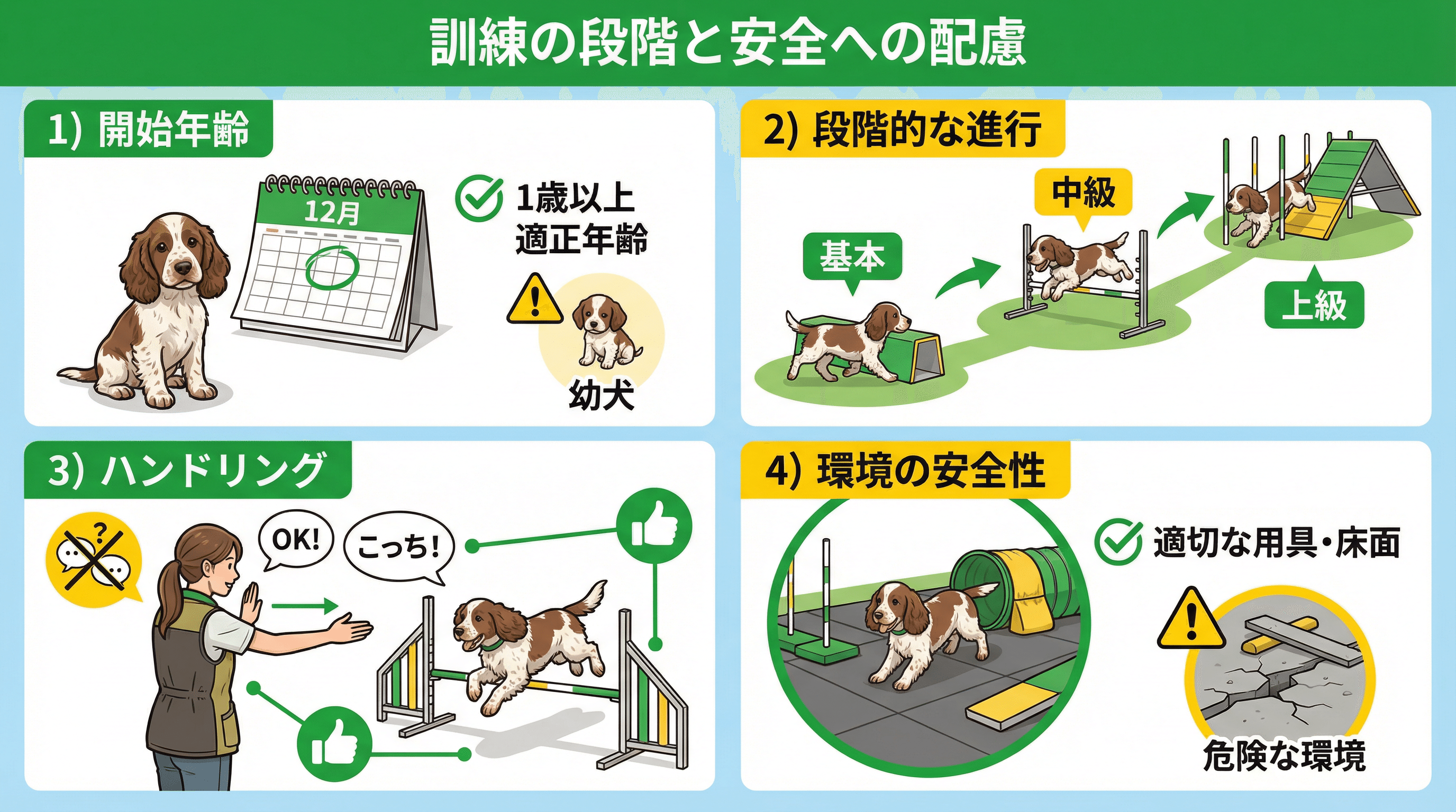 アジリティのトレーニングは、段階的に進めることが重要である。急ぎすぎると、怪我のリスクが高まり、犬の自信を損なう可能性がある。