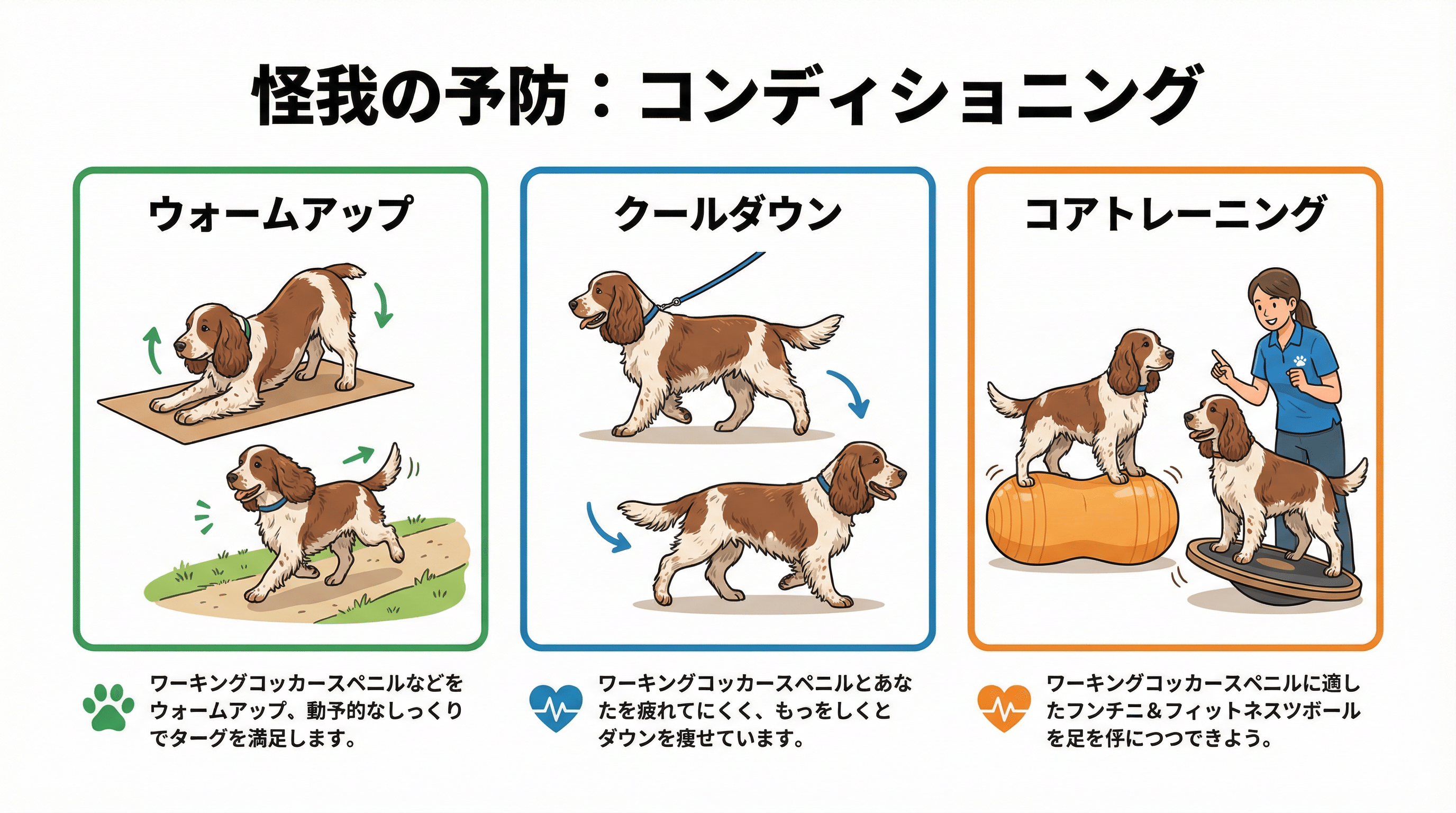 アジリティは、犬にとって身体的に要求の高いスポーツである。適切なコンディショニングを行うことで、怪我のリスクを減らし、パフォーマンスを向上させることができる。