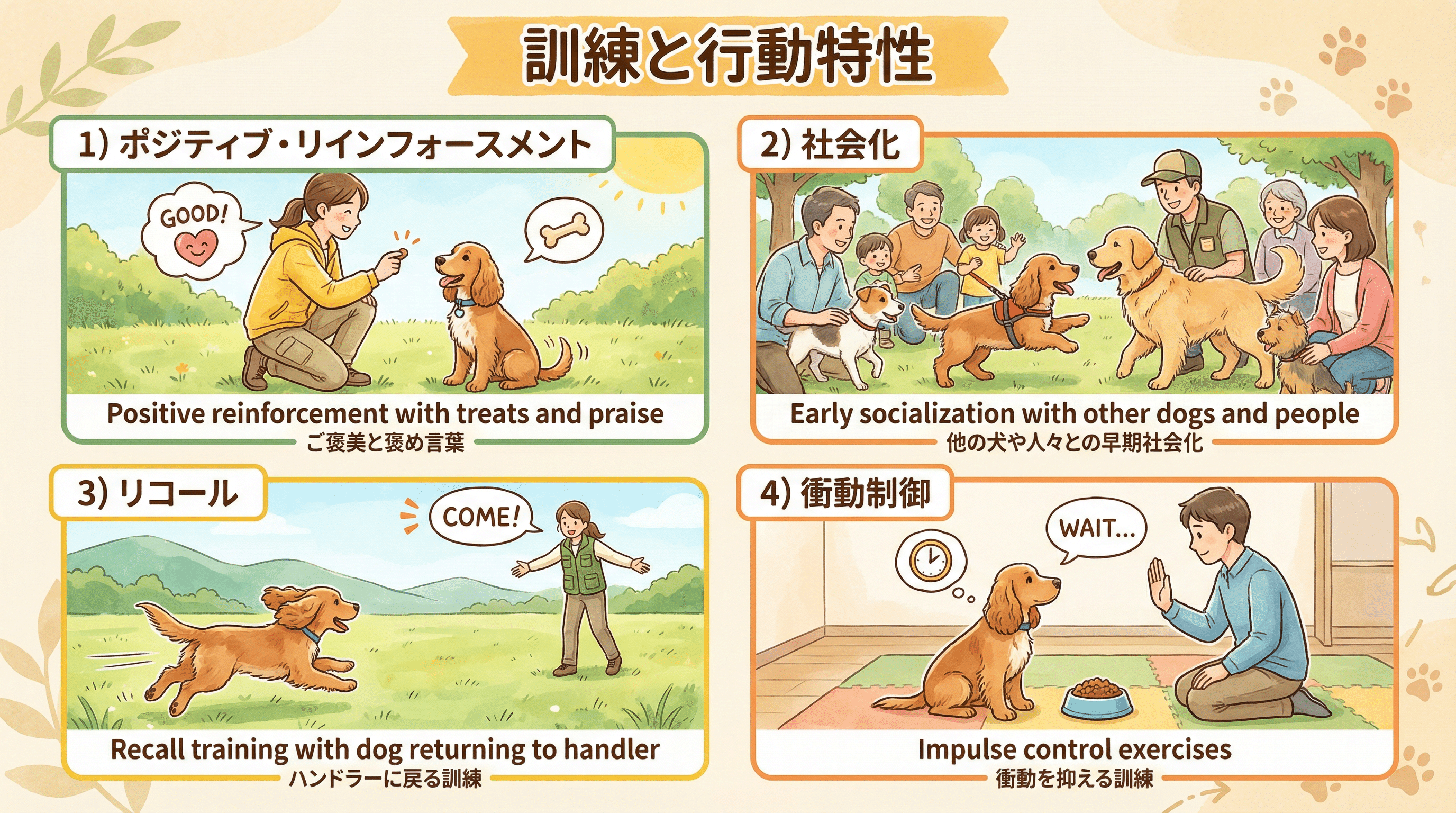 ワーキングコッカースパニエルは、作業をすることに喜びを感じる犬種である。トレーニングを単なる「しつけ」としてではなく、犬との共同作業として楽しむことで、より強い絆を築くことができる。