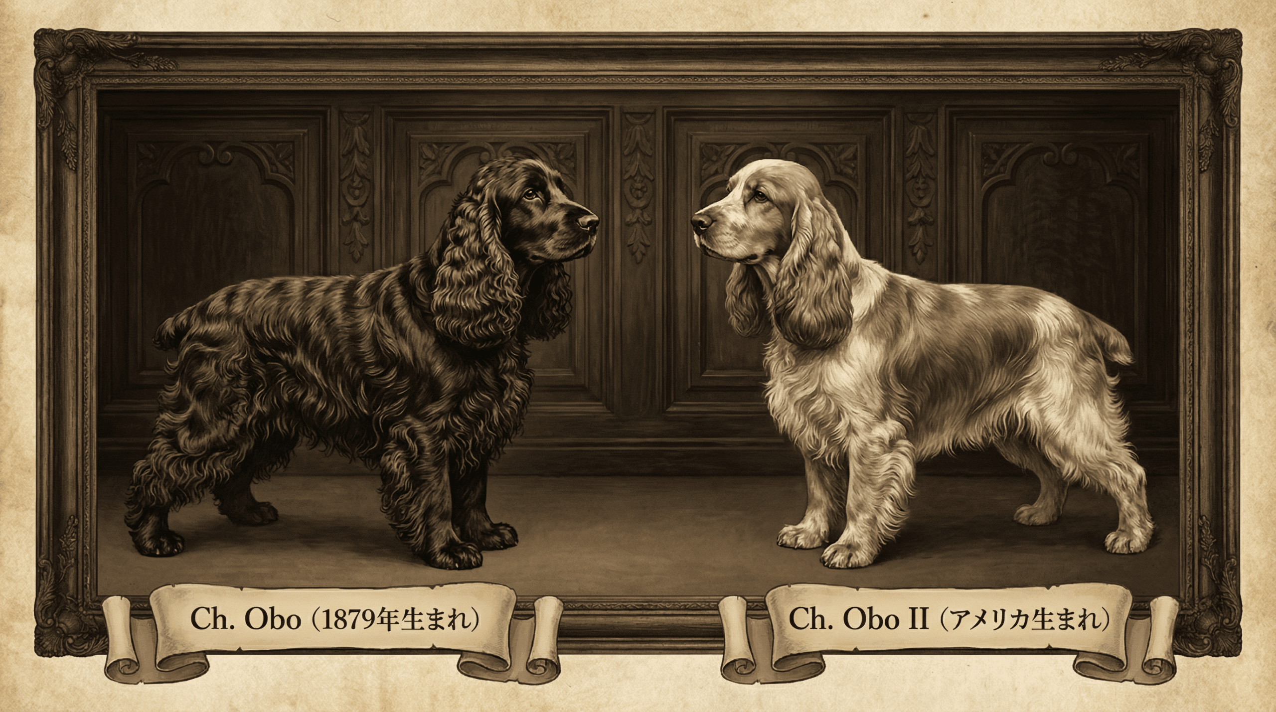 近代コッカースパニエルの歴史において、最も重要な犬の一頭がCh. Obo(1879年生まれ)である。Ch. Oboは、イギリスで生まれた黒色のコッカースパニエルで、その優れた体型と気質により、多くの子孫を残した。彼は「近代コッカースパニエルの父」とも称され、現代のコッカースパニエルの血統の多くに彼の遺伝子が受け継がれている。