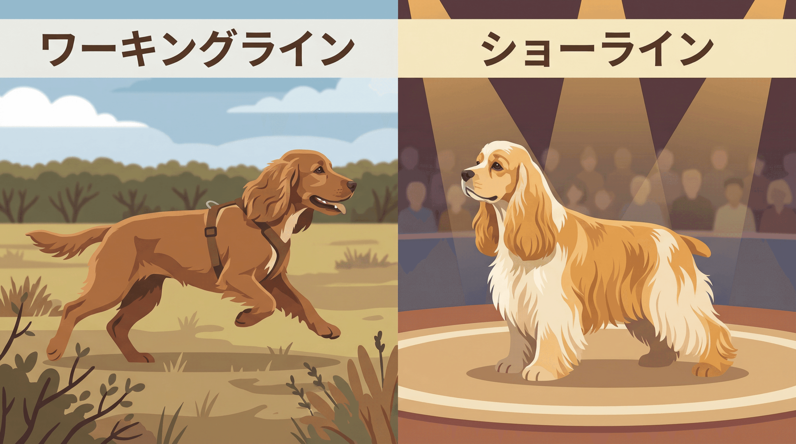 20世紀に入ると、コッカースパニエルの中で、実猟能力を重視する「ワーキングライン」と、外見の美しさを重視する「ショーライン」の二つの系統が明確に分かれるようになった。