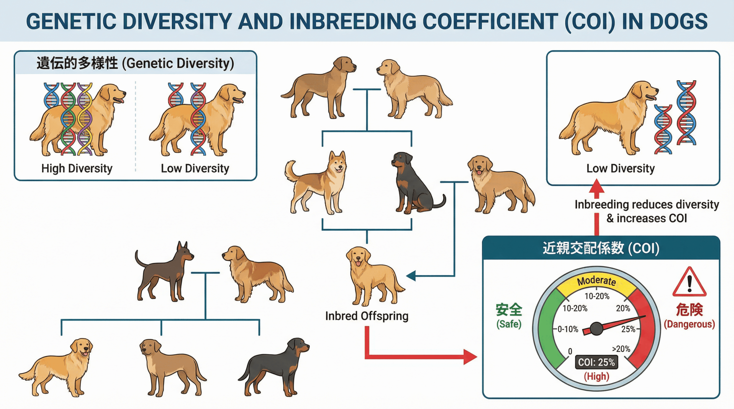 純血種の犬の繁殖において、遺伝的多様性の維持は重要な課題である。遺伝的多様性が低下すると、近親交配による弊害(インブリーディング・デプレッション)が生じやすくなる。