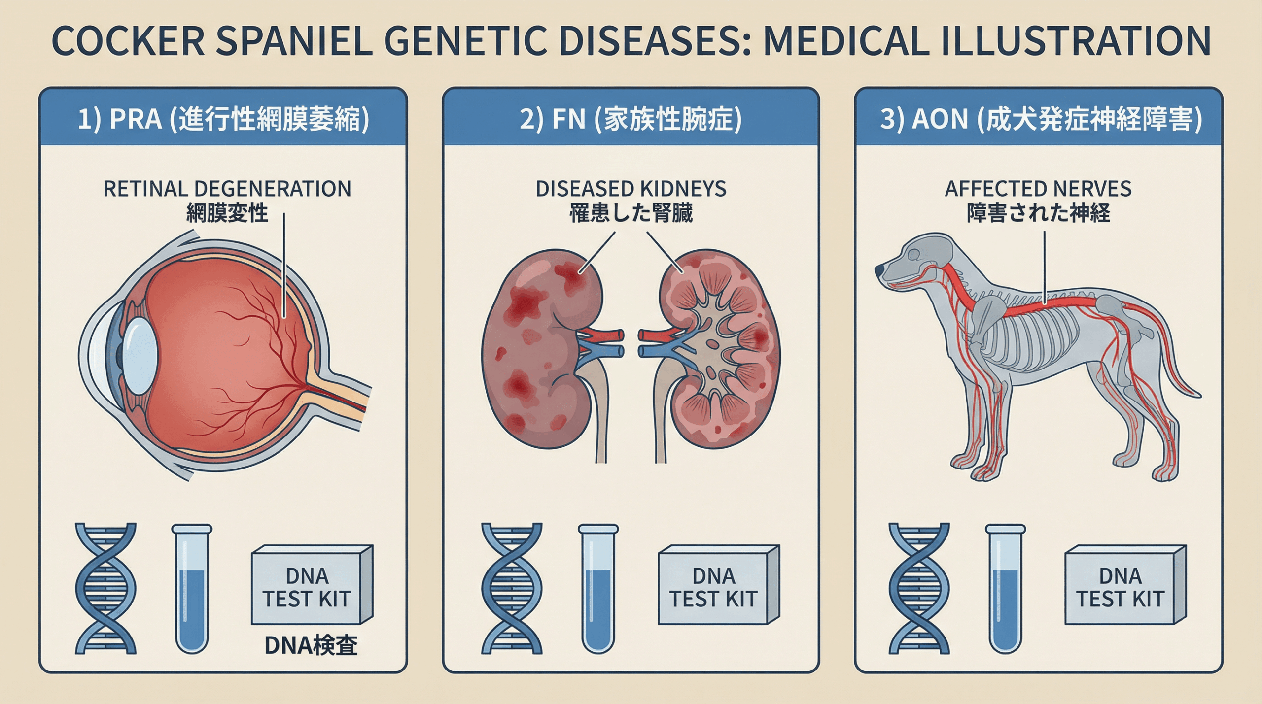 コッカースパニエルには、いくつかの遺伝性疾患が知られている。これらの疾患の多くは、特定の遺伝子変異によって引き起こされ、DNA検査によって検出することが可能である。