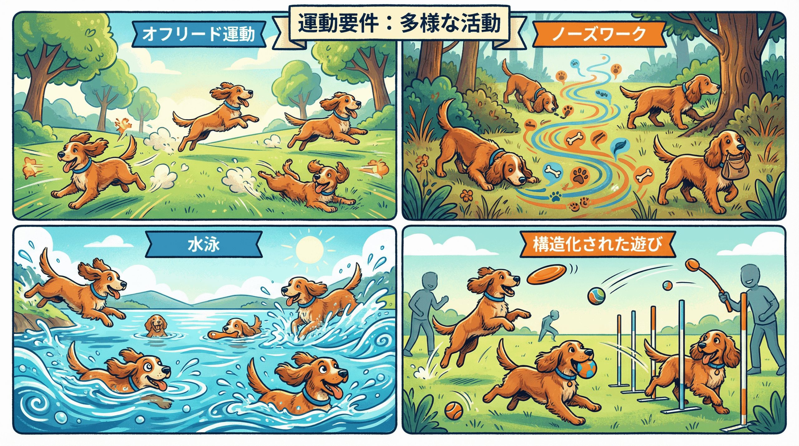 ワーキングコッカースパニエルに必要な運動量は、1日あたり最低でも1〜2時間である。しかし、単なる散歩だけでは不十分であり、多様な活動を組み合わせることが重要である。