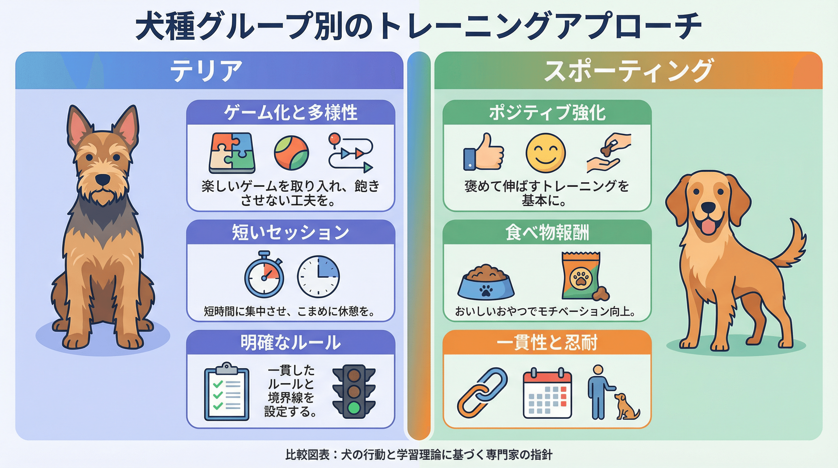 これら二つのグループへのアプローチは、正反対と言っても過言ではありません。それぞれの犬種の本能と動機を理解し、トレーニング方法を調整することが不可欠です 。