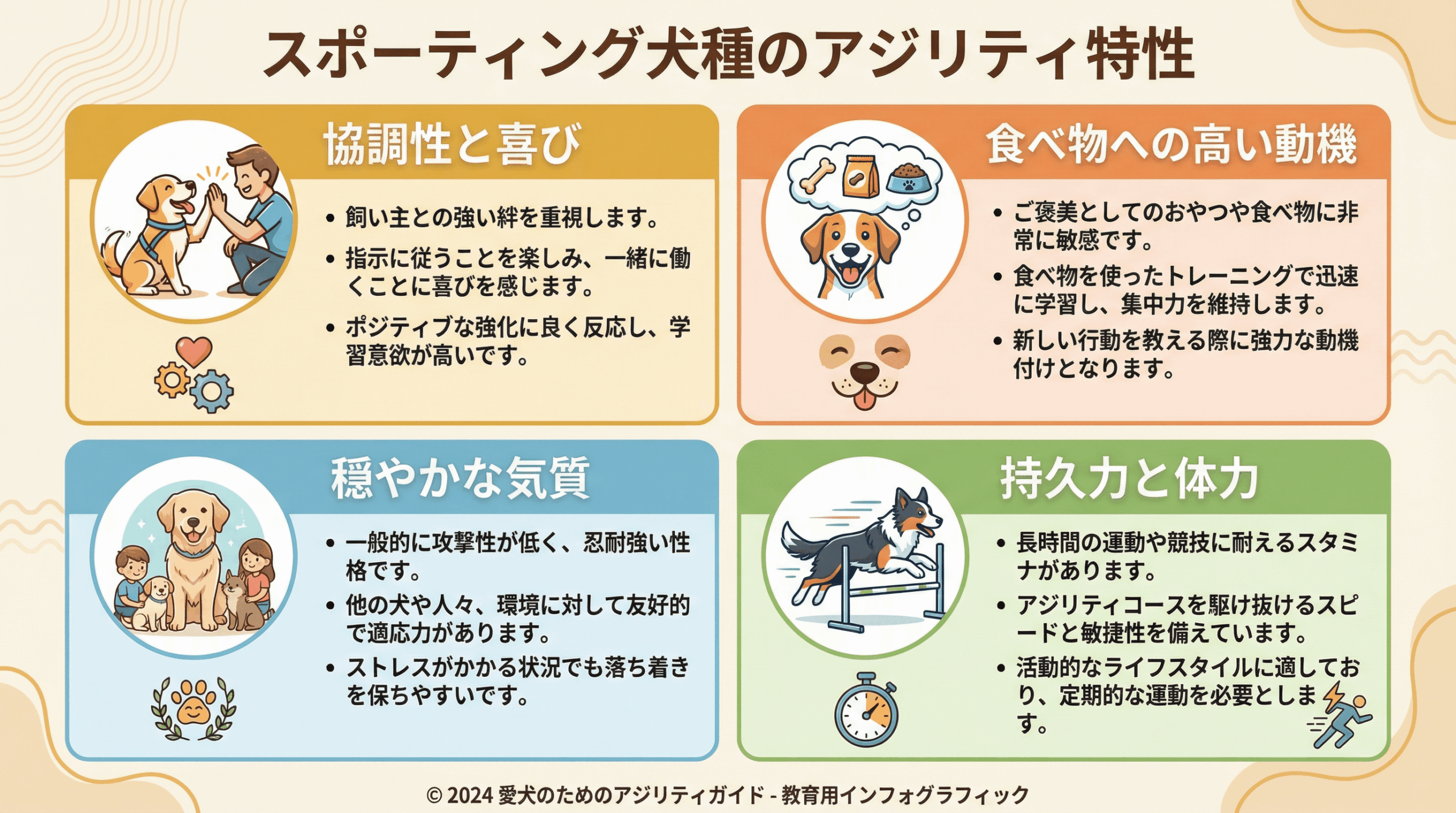 テリアの持つ「なぜそれをする必要があるの?もっと楽しい方法はないの?」という問いかけと、スポーティングドッグの「あなたと一緒なら何でも楽しい!」という純粋な喜び。どちらもアジリティの素晴らしい側面です。犬種の特性は単なるレッテルではなく、愛犬の個性と深く向き合うためのヒントです。彼らの本能を尊重し、違いを愛し、それぞれに合った方法で対話することで、どんな犬種とも最高のパートナーシップを築くことができるのです。
