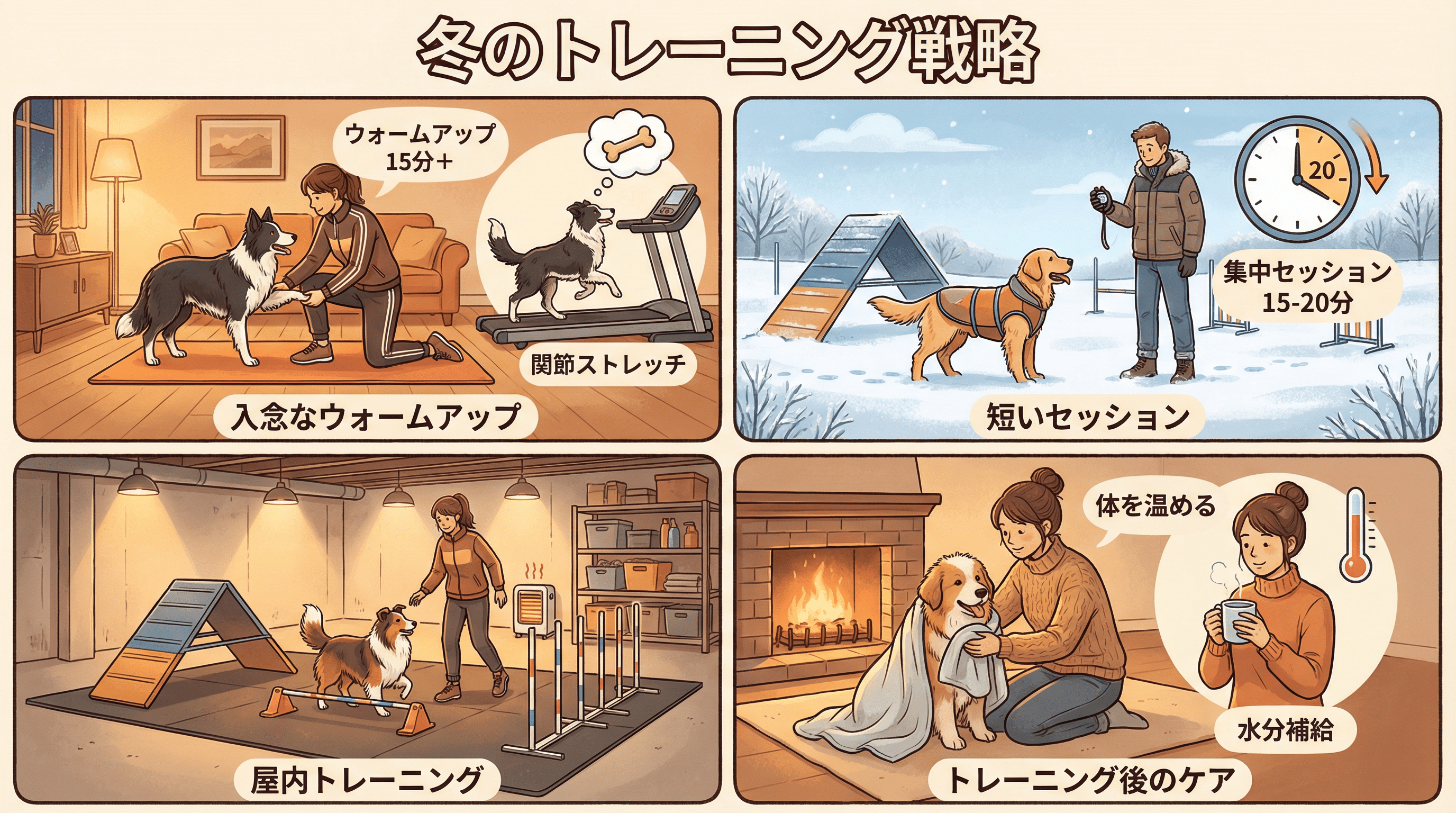 冬のトレーニングは、量よりも質を重視し、安全を最優先するアプローチが求められます。天候や愛犬のコンディションに合わせて、柔軟に計画を調整しましょう。