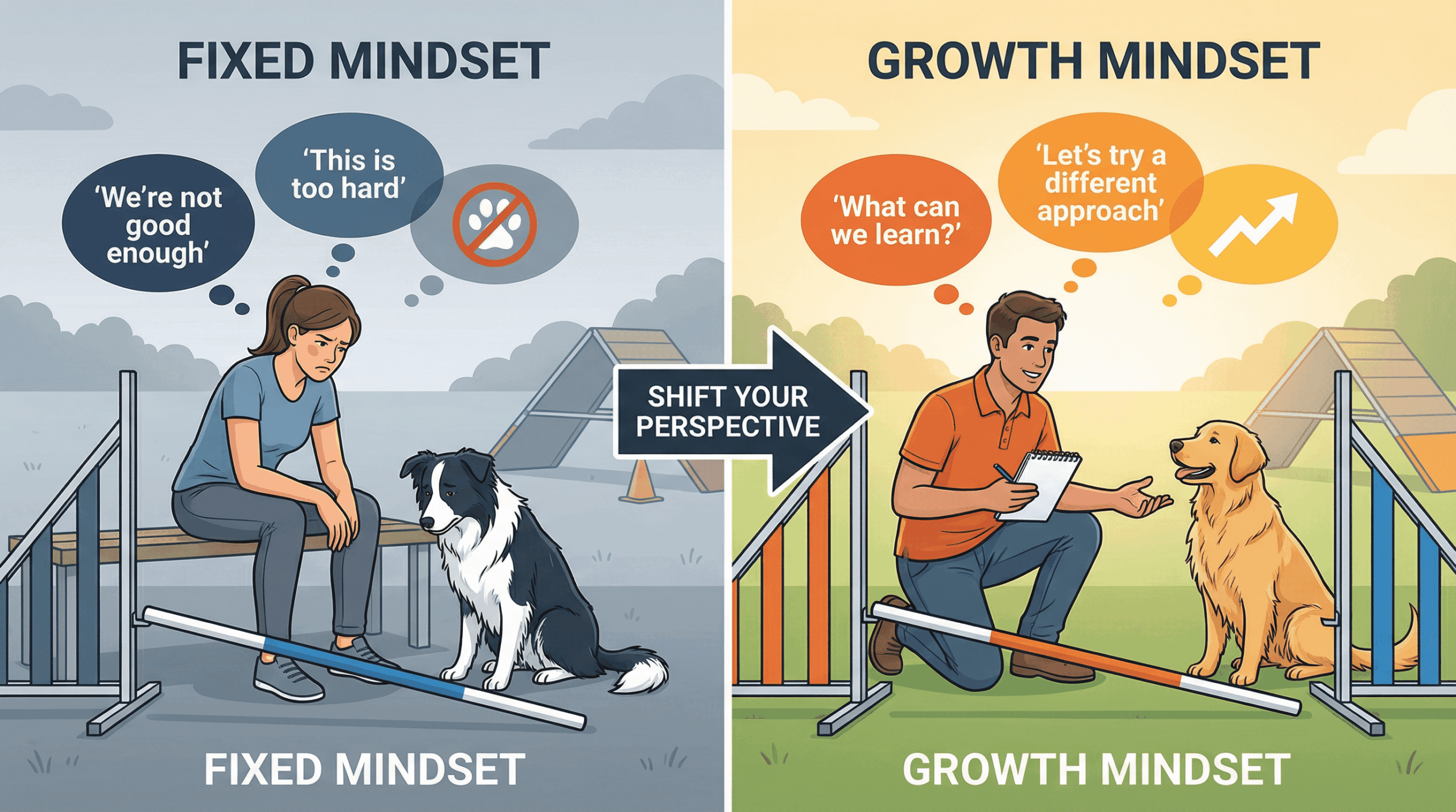 ドッグアジリティの競技会では、完璧なランは稀です。バーの落下、コンタクトの失敗、コースオフ。どんなに練習を積んだチームでも、失敗は必ず訪れます。しかし、トップハンドラーとそうでない人を分けるのは、失敗の数ではなく、失敗にどう向き合うかという「マインドセット」です。この記事では、心理学者キャロル・ドゥエックが提唱した「成長のマインドセット」をアジリティに応用し、失敗を単なる失望ではなく、成長のための最も価値ある情報源に変える方法を解説します。