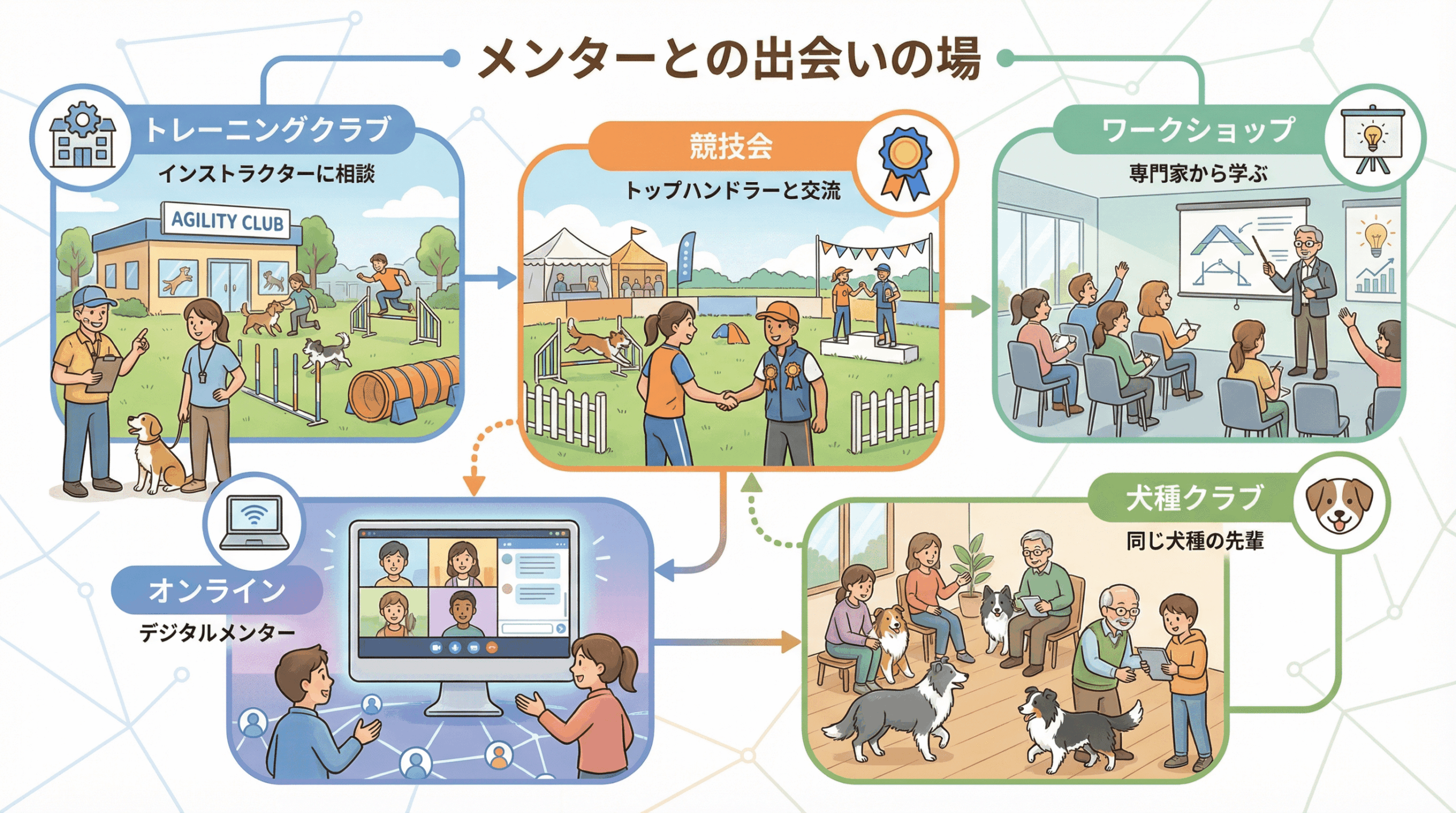 ドッグアジリティの旅は、時に長く、複雑で、一人で歩むには困難な道のりです。オンラインリソースや書籍から多くの知識を得ることはできますが、個々の犬とハンドラーに合わせた具体的なアドバイスや、精神的な支えとなってくれる存在の価値は計り知れません。その役割を担うのが「メンター」です。メンターとは、単なるインストラクターではなく、あなたの成長を長期的に見守り、導き、そして成功を共に喜んでくれる指導者であり、道標です。この記事では、アジリティの旅を加速させるメンターの重要性、良いメンターの見つけ方、そして実りある関係を築くためのアプローチについて解説します。