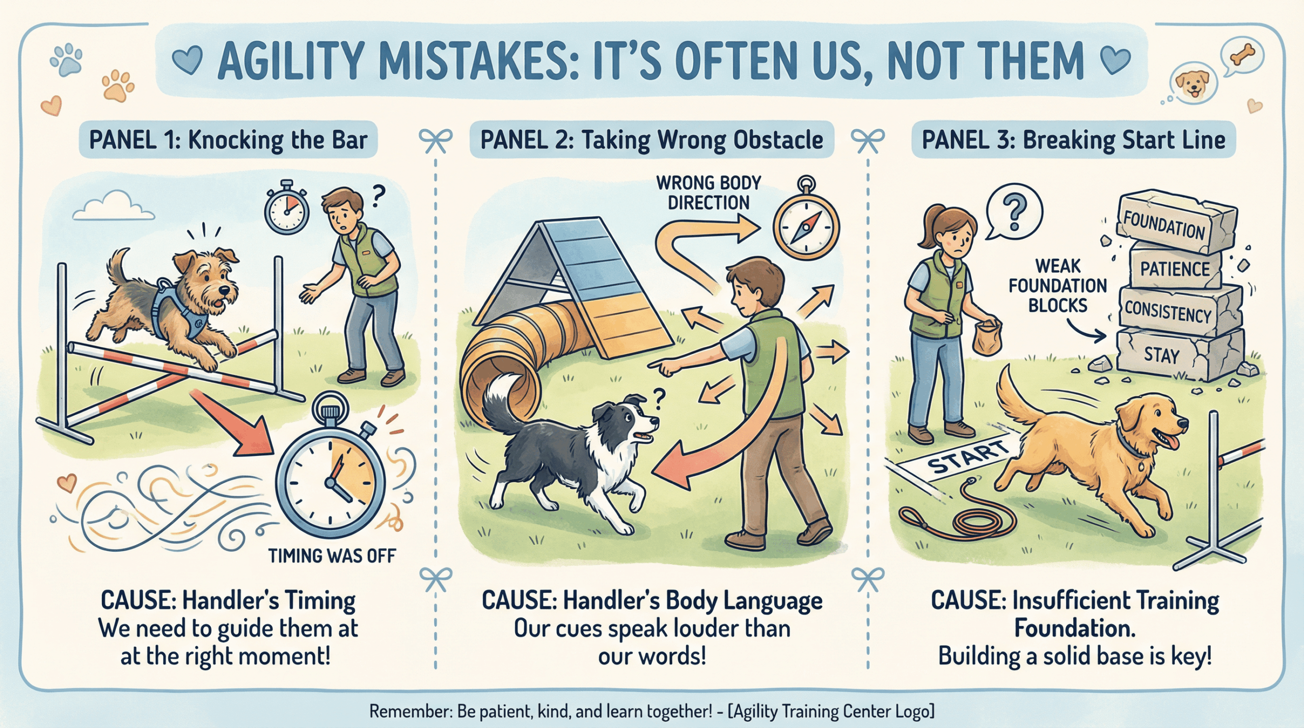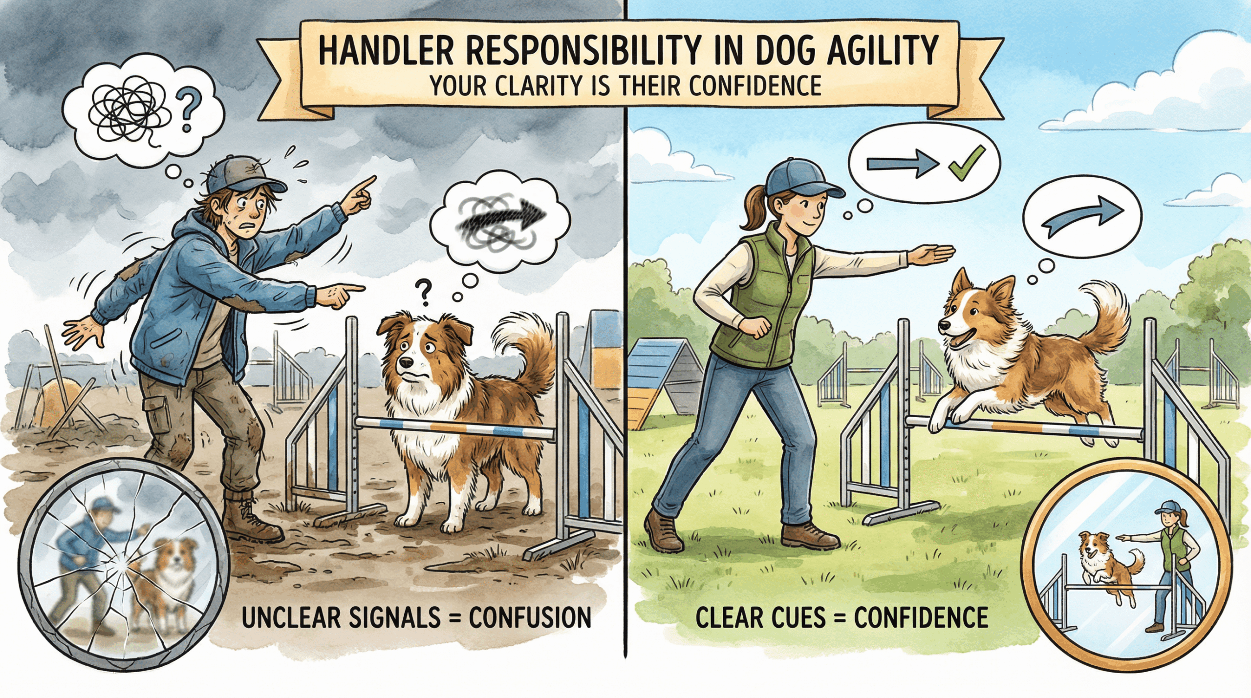 これは、⽿の痛い、しかし私たちが決して⽬を背けてはならない、厳粛な真実だ。バーを落としたのも、トンネルを間違えたのも、スタートでフライングしたのも、その直接の「⾏為者」は⽝かもしれない。しかし、その⾏動を引き起こした「原因」は、ほぼ例外なく、ハンドラーの側にある。