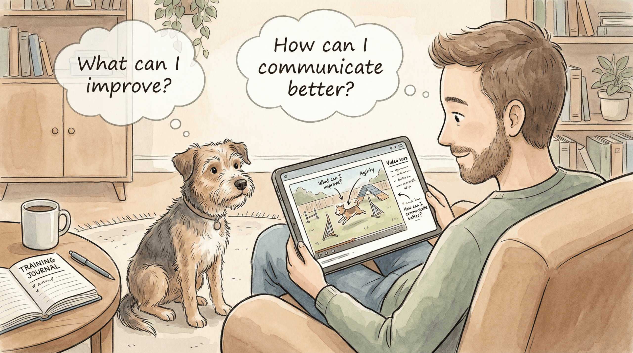 この視点に⽴つとき、あなたは、失敗に対して怒りや失望を感じる代わりに、「なるほど、そうか。教えてくれてありがとう」と、感謝の念すら抱けるようになるだろう。そして、そのフィードバックを元に、⾃分のハンドリングを⾒直し、次のトレーニングの課題を設定することができる。そのための具体的なツールとして、「ビデオ分析」と「トレーニング⽇誌」の活⽤を強く推奨する。⾃分のランを客観的に⾒返すことで、思い込みや記憶違いに気づくことができる。また、⽇々の練習内容、成功したこと、失敗したこと、そしてその原因分析を書き留めておくことで、進歩の軌跡が可視化され、次に取り組むべき課題が明確になる。この建設的なサイクルこそが、あなたと愛⽝を、共に成⻑させてくれる唯⼀の道なのだ。