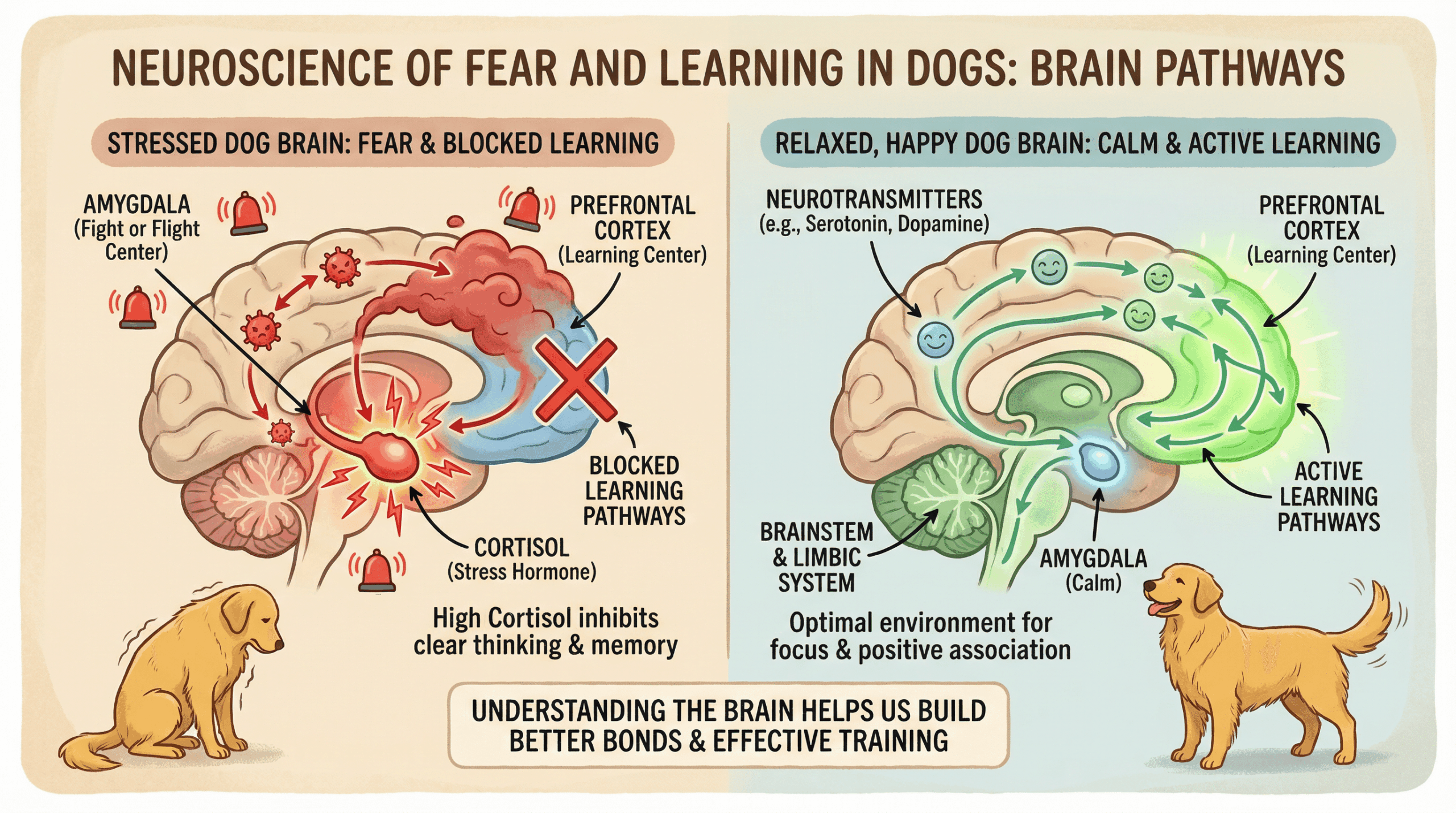 この恐怖は、単なる精神論ではない。科学的にも、⽝の学習能⼒に深刻な悪影響を与えることが証明されている。強いストレスや恐怖を感じたとき、⽝の体内では、コルチゾールなどのストレスホルモンが⼤量に分泌される。このホルモンは、脳の思考や学習を司る部分(特に前頭前野)の働きを抑制し、動物を「闘争か、逃⾛か(Fight or Flight)」という、本能的な⽣存モードへと切り替えてしまう。
