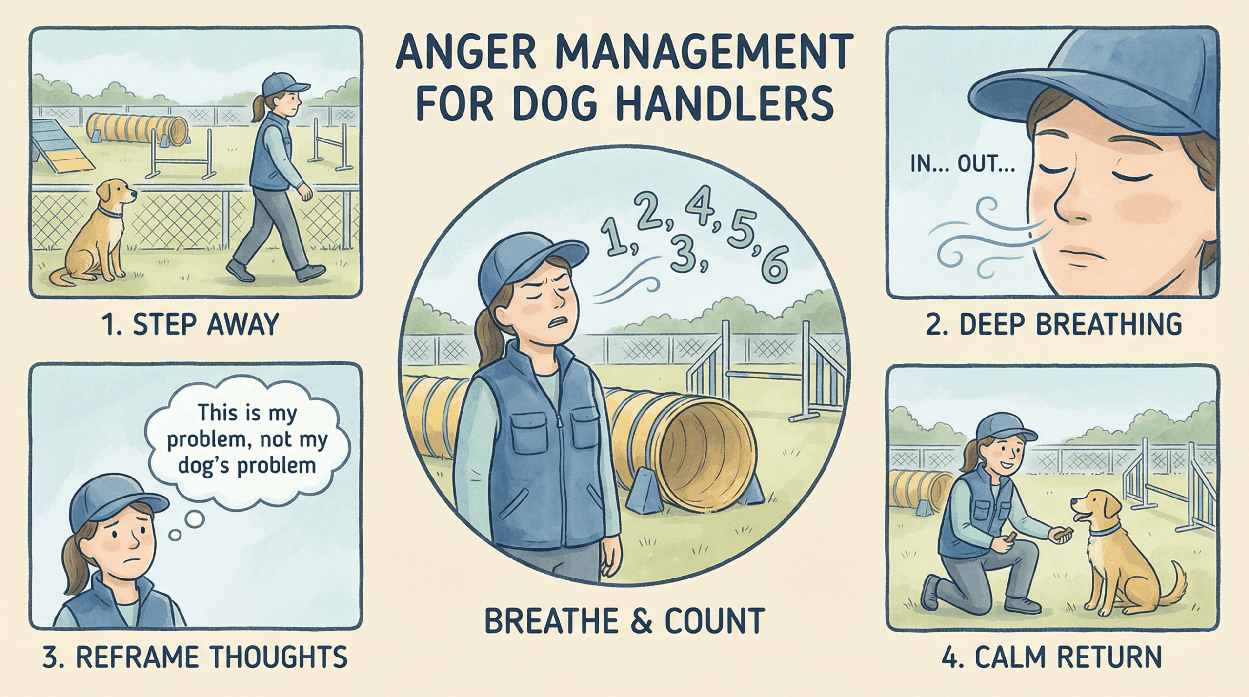 もし、あなたがコース上やトレーニング中に、コントロールできないほどの怒りを感じたならば、それは、あなたのハンドリング技術や、⽝のパフォーマンスの問題ではない。それは、あなた⾃⾝の、メンタルマネジメントの問題だ。その時は、⼀度、すべての練習を中断し、コースから離れる勇気を持つべきだ。そして、なぜ⾃分がそれほどまでに感情的になるのか、その根本原因(過度な期待、他者との⽐較、プライドなど)と、冷静に向き合う必要がある。
