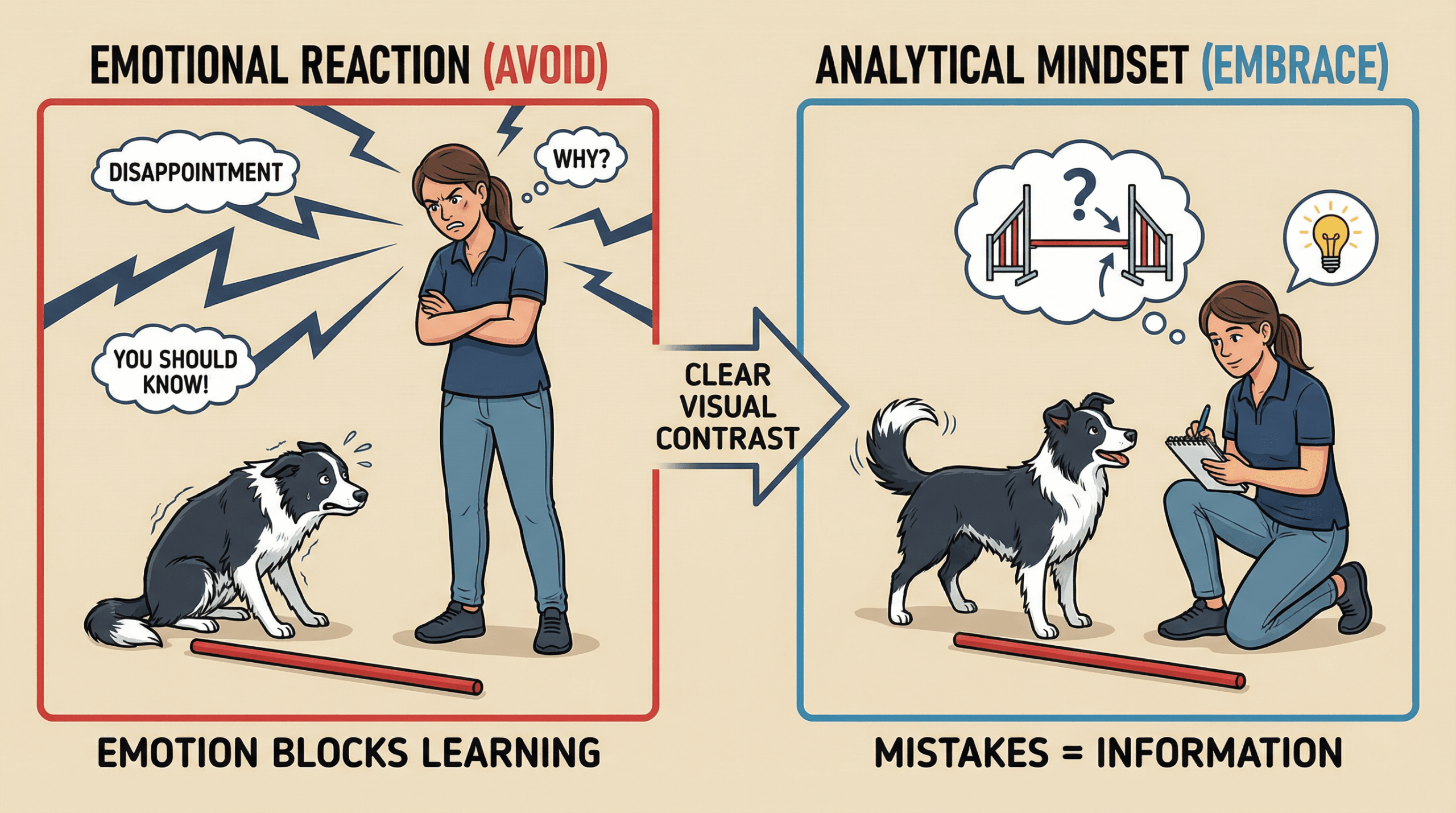 コース上でミスが起きた瞬間、多くのハンドラーは「ああ、失敗した!」と感情的に反応してしまいます。しかし、この感情的な反応こそが、成長の最大の妨げになります。犬はハンドラーの失望感を敏感に察知し、不安になったり、自信を失ったりする可能性があります。