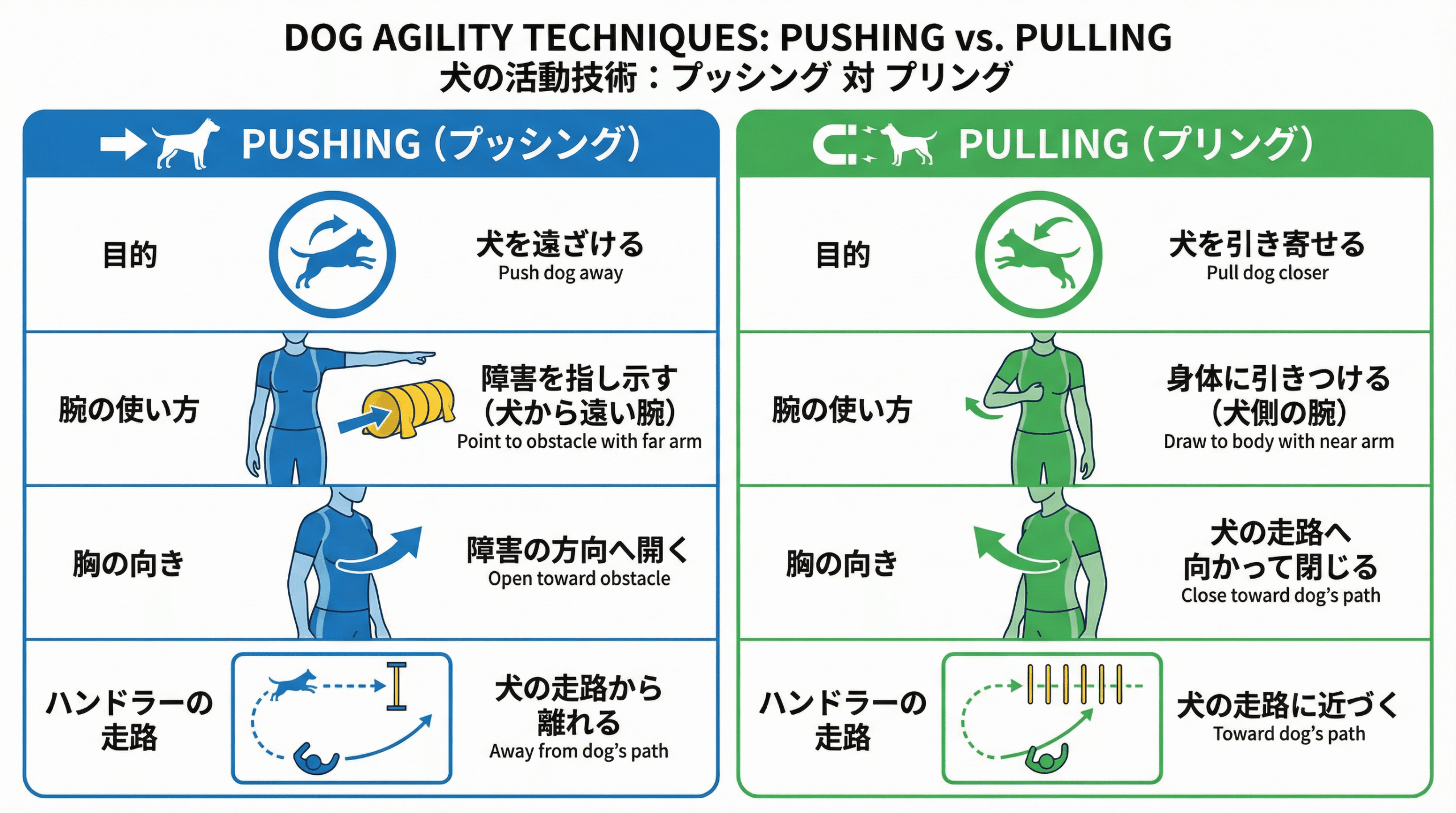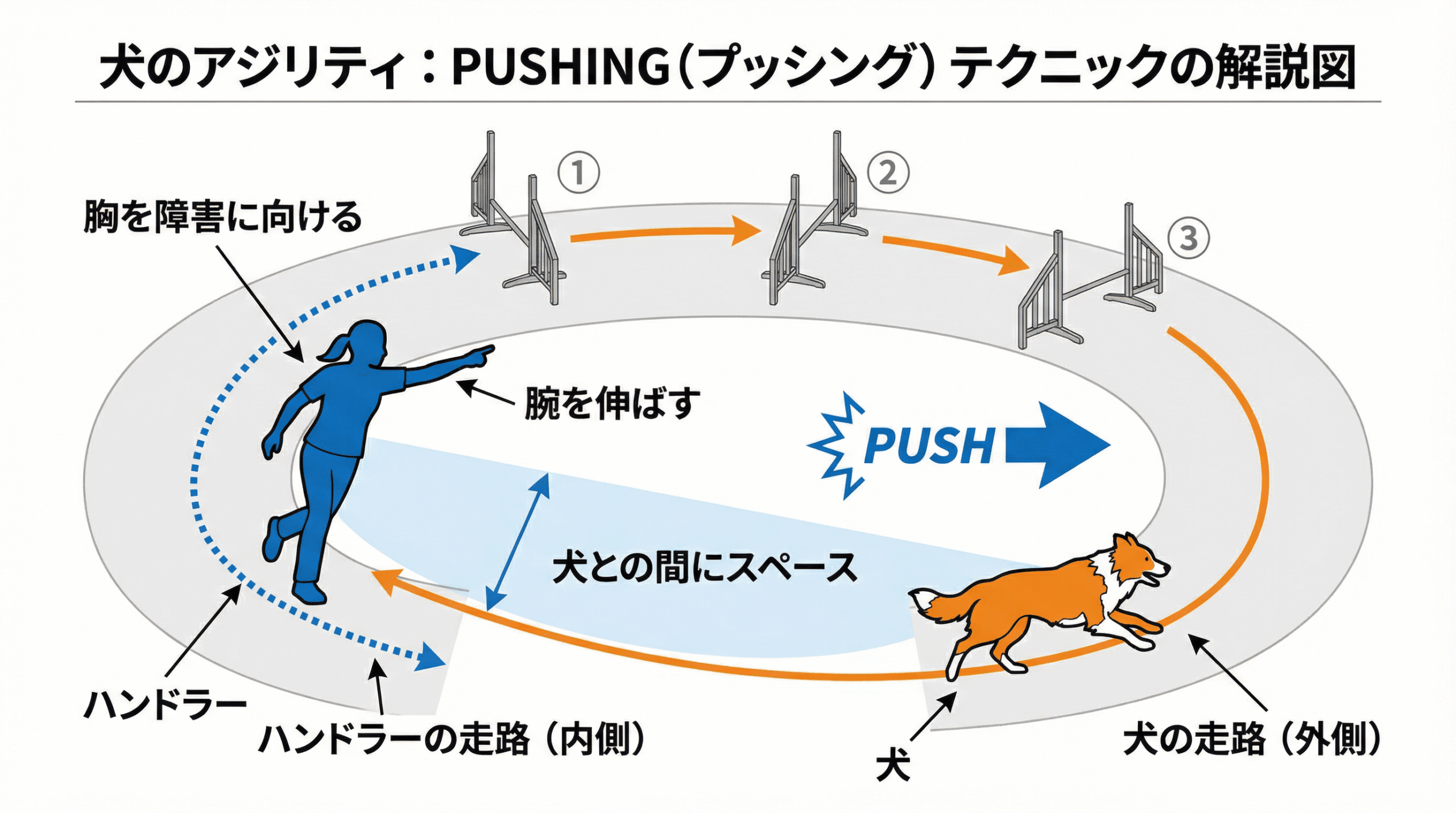 プッシングを成功させる鍵は、ハンドラーの明確なボディランゲージにあります。犬に進んでほしい方向の腕(犬から遠い方の腕)を障害に向かって伸ばし、胸と肩もそちらへ向けます。同時に、ハンドラー自身は犬の走路から離れてスペースを作ることで、犬は「あちらへ行っていいんだ」と理解し、自信を持ってハンドラーから離れて障害に向かいます。