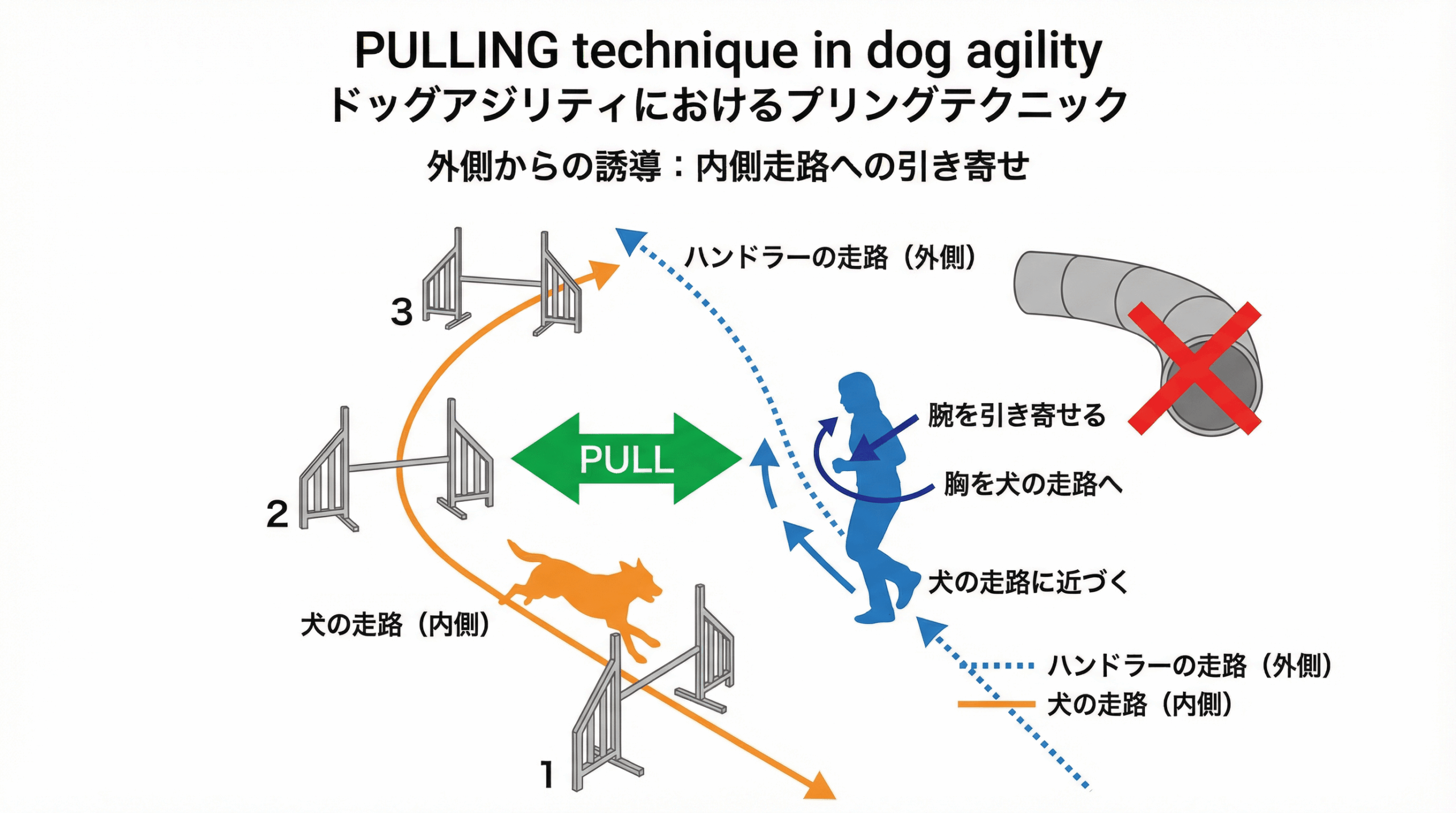 プリングとは、逆にハンドラーが犬を自分の身体の方へ「引き寄せる」ようにして、ハンドラーに近いラインを走らせる技術です。タイトなターンをさせたい時や、オフコースになりそうな犬を正しいラインに引き戻したい時に有効です。