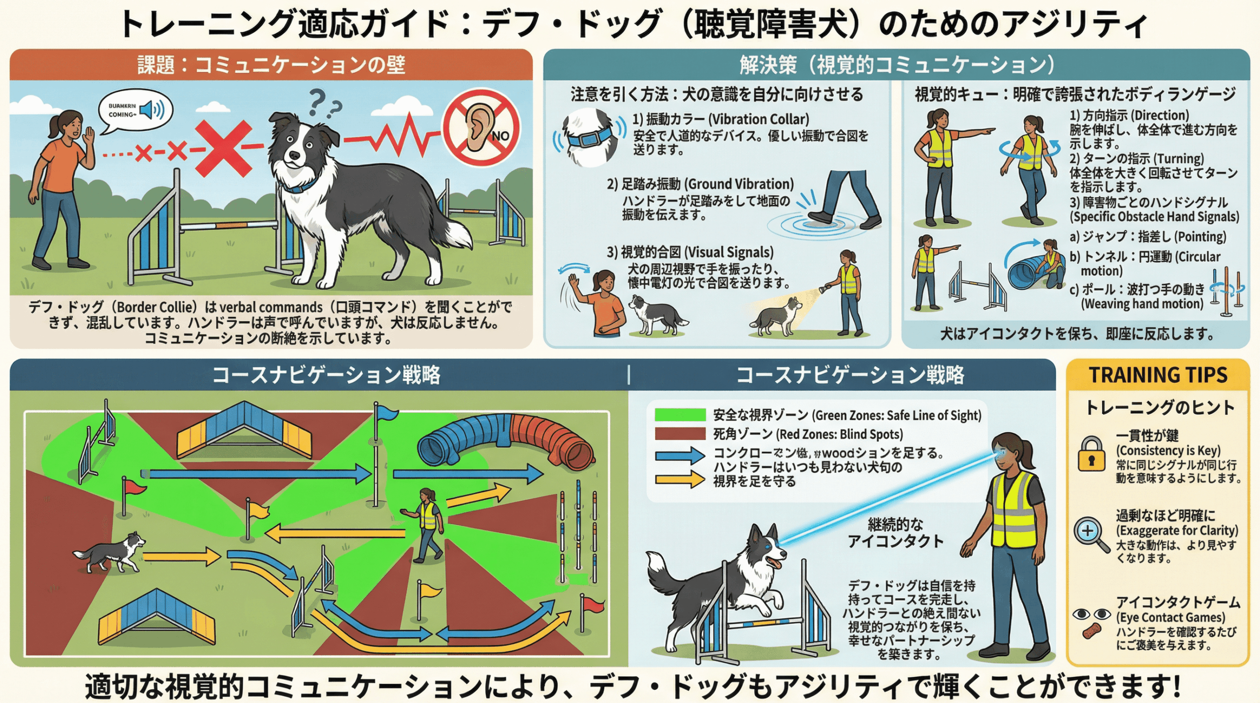 聴覚の代わりに視覚を最大限に活用します。ハンドラーの体全体を使った明確なボディランゲージと、一貫性のあるハンドシグナルが主要なコミュニケーション手段となります。注意を引くために振動する首輪(バイブレーションカラー)を使ったり、地面を踏み鳴らして振動を伝えたりする方法があります。コース上では、犬が常にハンドラーの動きを確認できるよう、ハンドラーは犬の視界から消えないように動くことが重要です 。