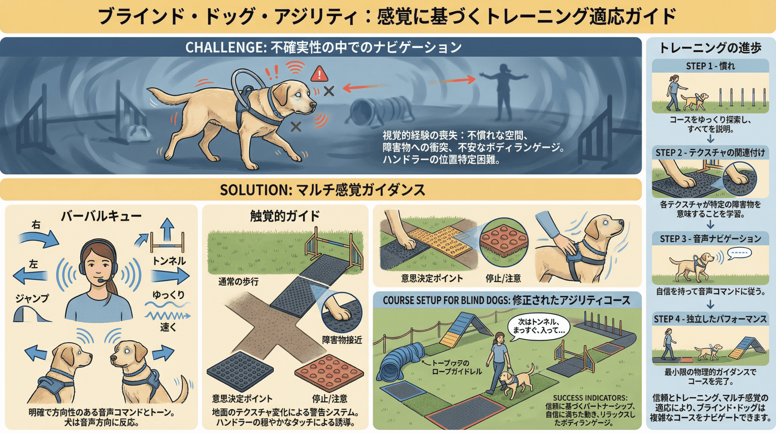 ハンドラーが犬の「目」となります。声のトーン、方向を示す言葉(バーバルキュー)、そして足元のテクスチャーの変化が、犬にとっての地図になります。「右」「左」「ジャンプ」といった明確な言葉のキューを教え込み、障害物の手前で足元のマットの素材を変えることで、犬に「何かが来る」と知らせることができます 。
