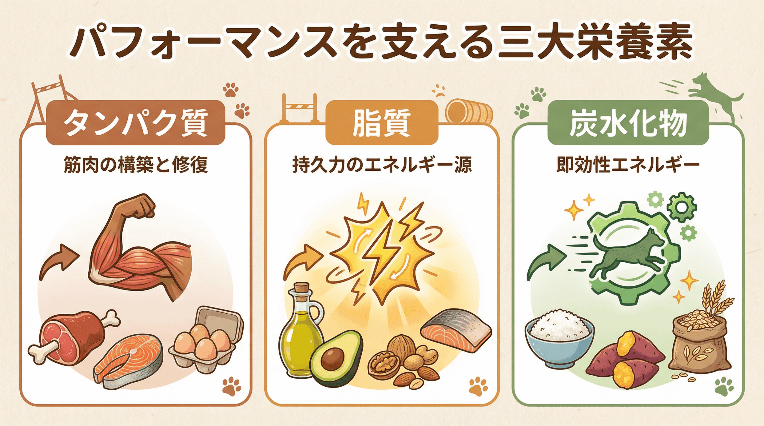 2. 脂質:持久力のエネルギー源 脂質は、最も効率の良いエネルギー源であり、特に長時間の運動や持久力を要する活動において重要です。タンパク質の2倍以上のカロリーを供給し、細胞膜の構成や脂溶性ビタミンの吸収にも関与します。オメガ3脂肪酸やオメガ6脂肪酸などの必須脂肪酸は、抗炎症作用や皮膚・被毛の健康維持にも役立ちます [2]。