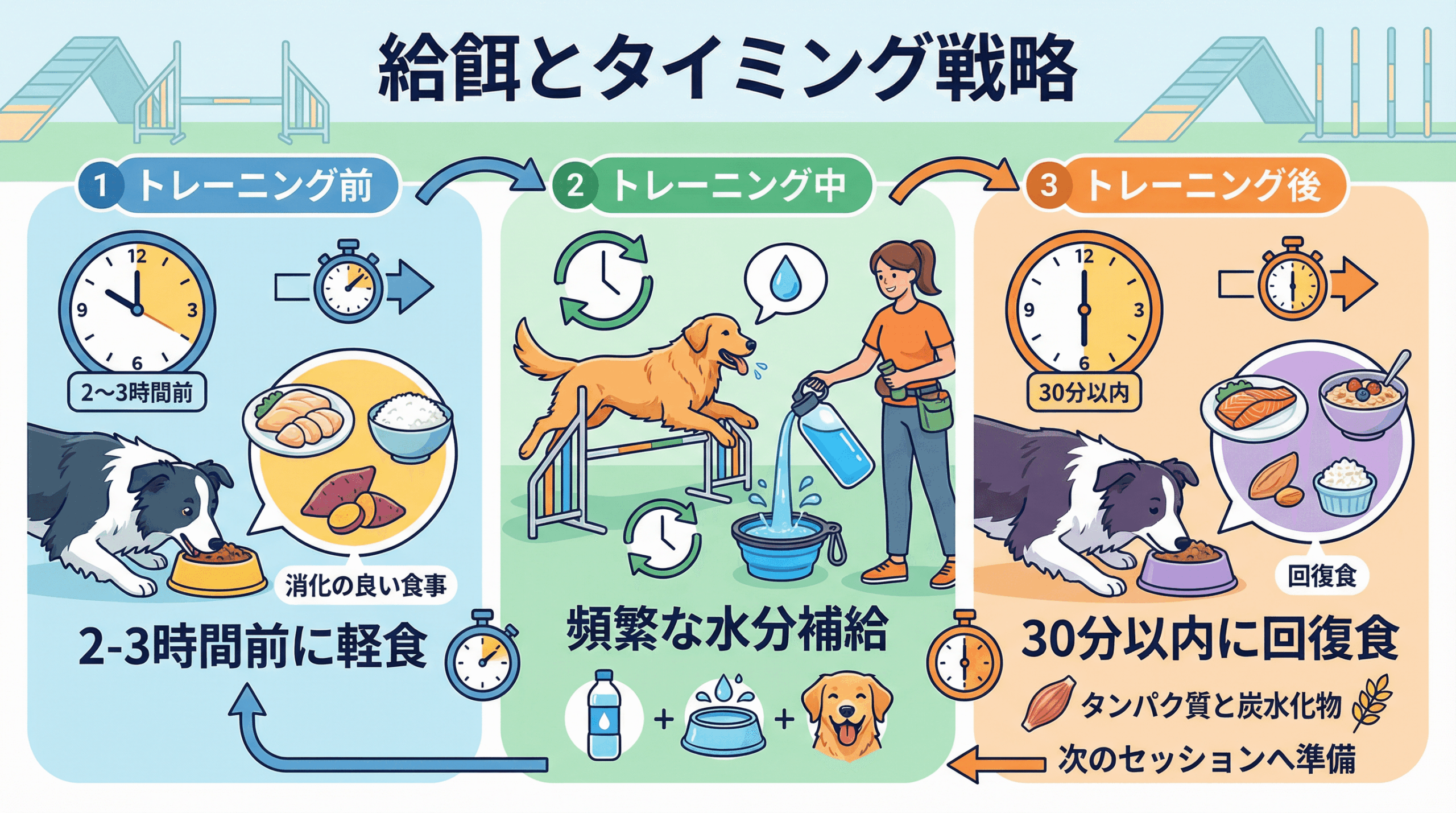1. トレーニング前 トレーニングの2〜3時間前に、消化の良い軽食を与えることが理想的です。満腹状態での激しい運動は、胃捻転などのリスクを高めるため避けるべきです。少量の炭水化物とタンパク質を含む食事が、トレーニング中のエネルギーレベルを維持するのに役立ちます。