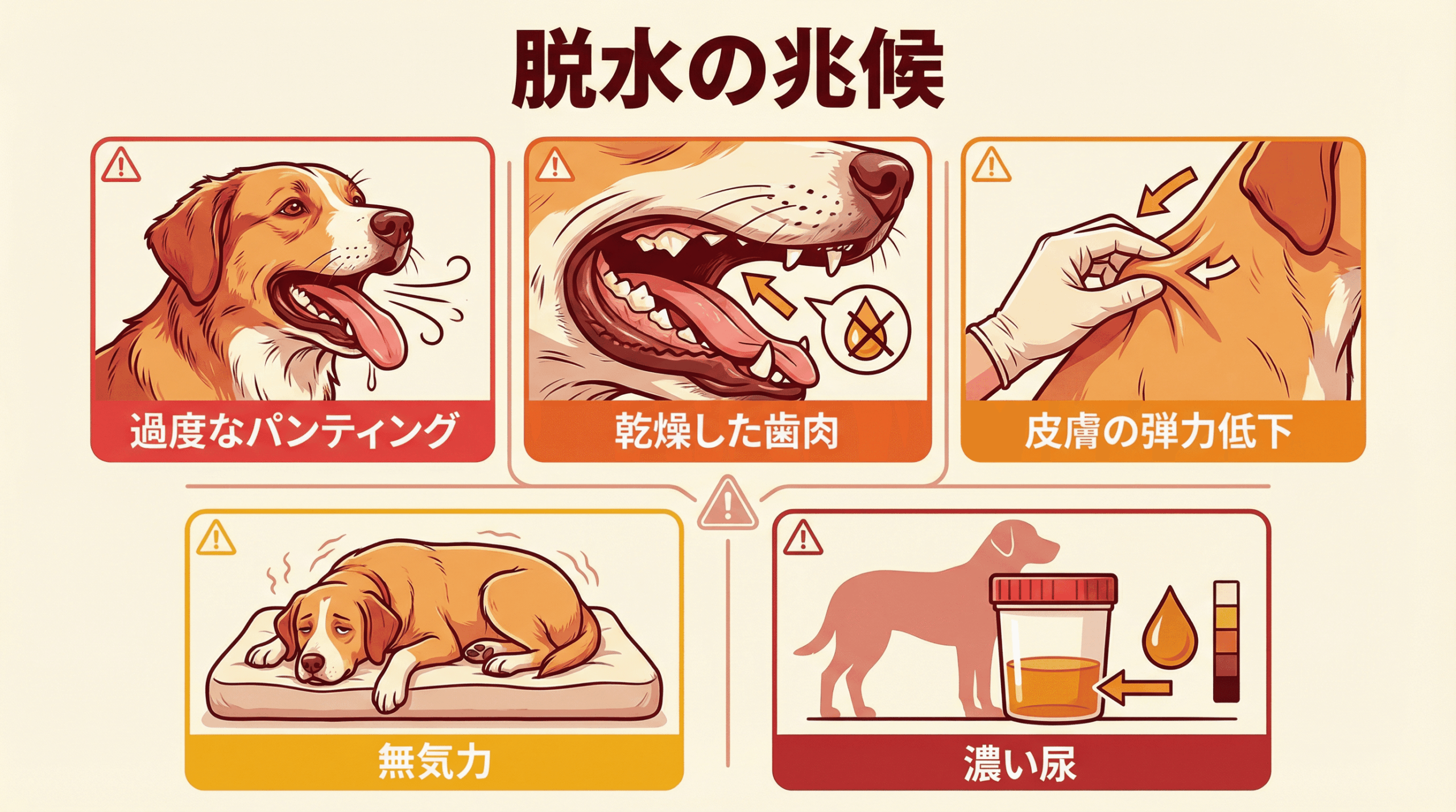 犬は人間のように言葉で喉の渇きを訴えることができません。そのため、ハンドラーが脱水の初期兆候を敏感に察知し、迅速に対応することが極めて重要です。以下のサインに注意してください。