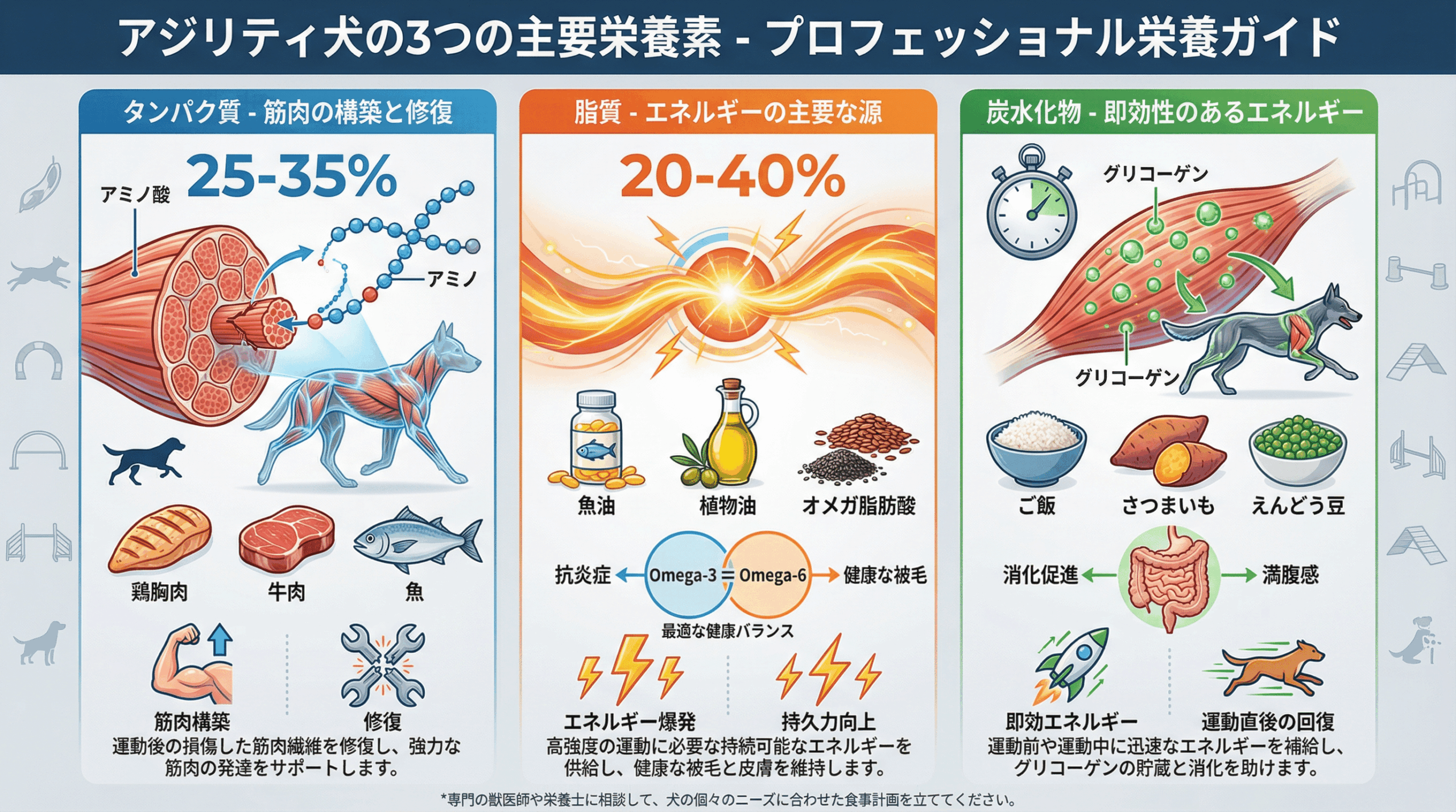アジリティドッグの食事は、一般的なペットの犬とは異なる、特別な要求に応える必要があります。彼らの食事は、主に3つの主要栄養素(タンパク質、脂質、炭水化物)のバランスによって成り立っています。