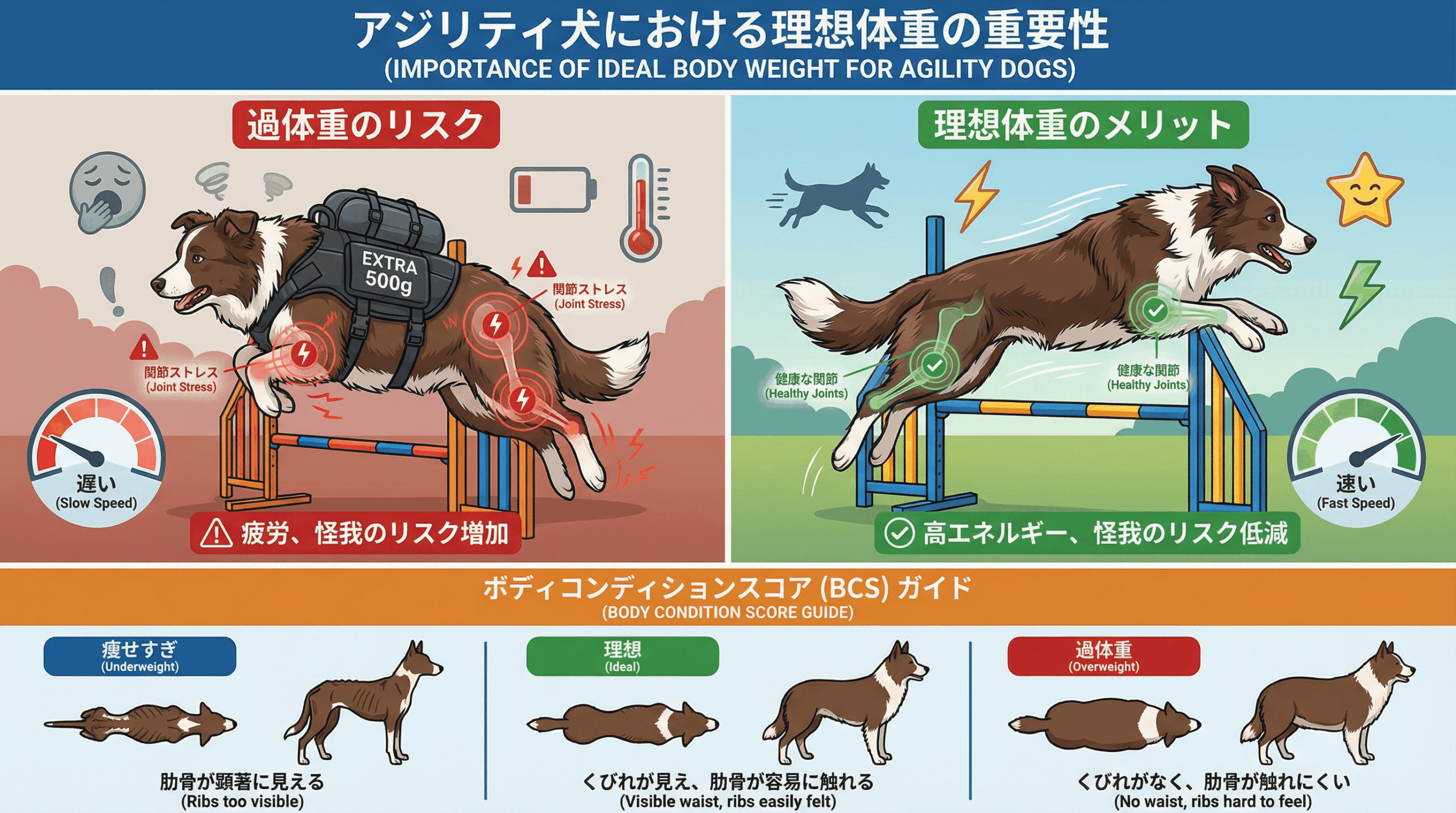 アジリティにおいて、体重はパフォーマンスと健康に直接的な影響を与えます。わずか500グラムの過剰な体重でさえ、ジャンプの高さ、ターンの速さ、そして何よりも関節への負担に大きな違いを生み出します。