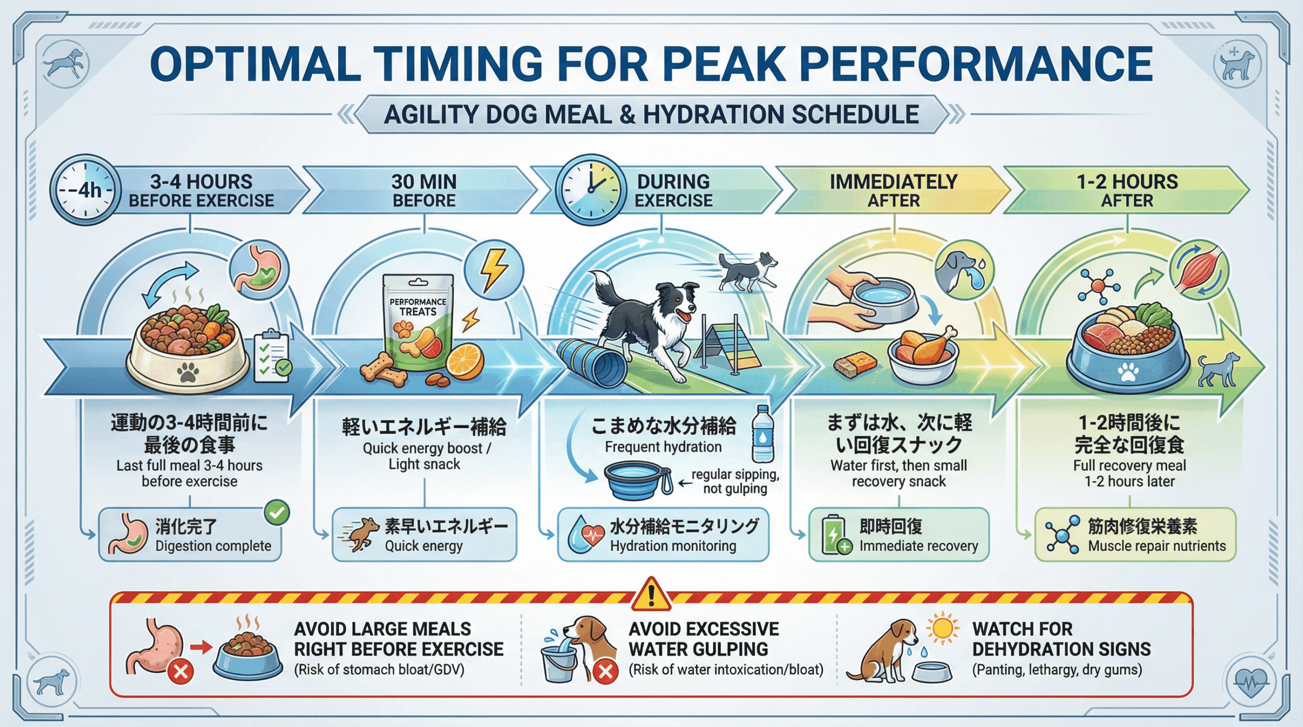 •トレーニング/競技前の食事:激しい運動の直前に大量の食事を与えると、消化不良や胃捻転などのリスクを高めます。最後のまとまった食事は、運動の最低でも3〜4時間前に済ませましょう [6]。