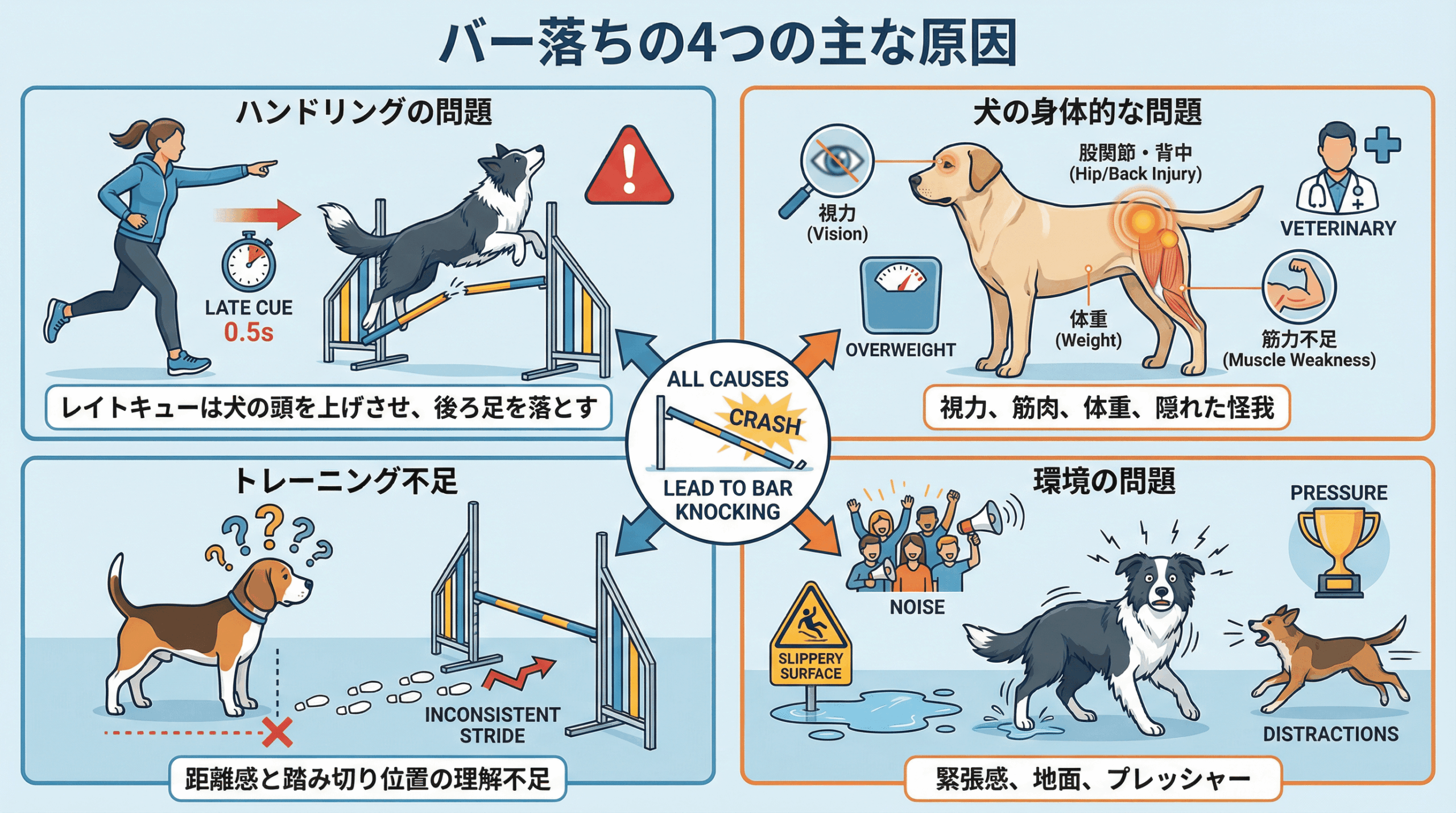 バー落ちを減らすためには、まずその原因を正しく理解することが不可欠です。主な原因は、ハンドリング、犬の身体能力、トレーニング、そして環境の4つに大別できます。