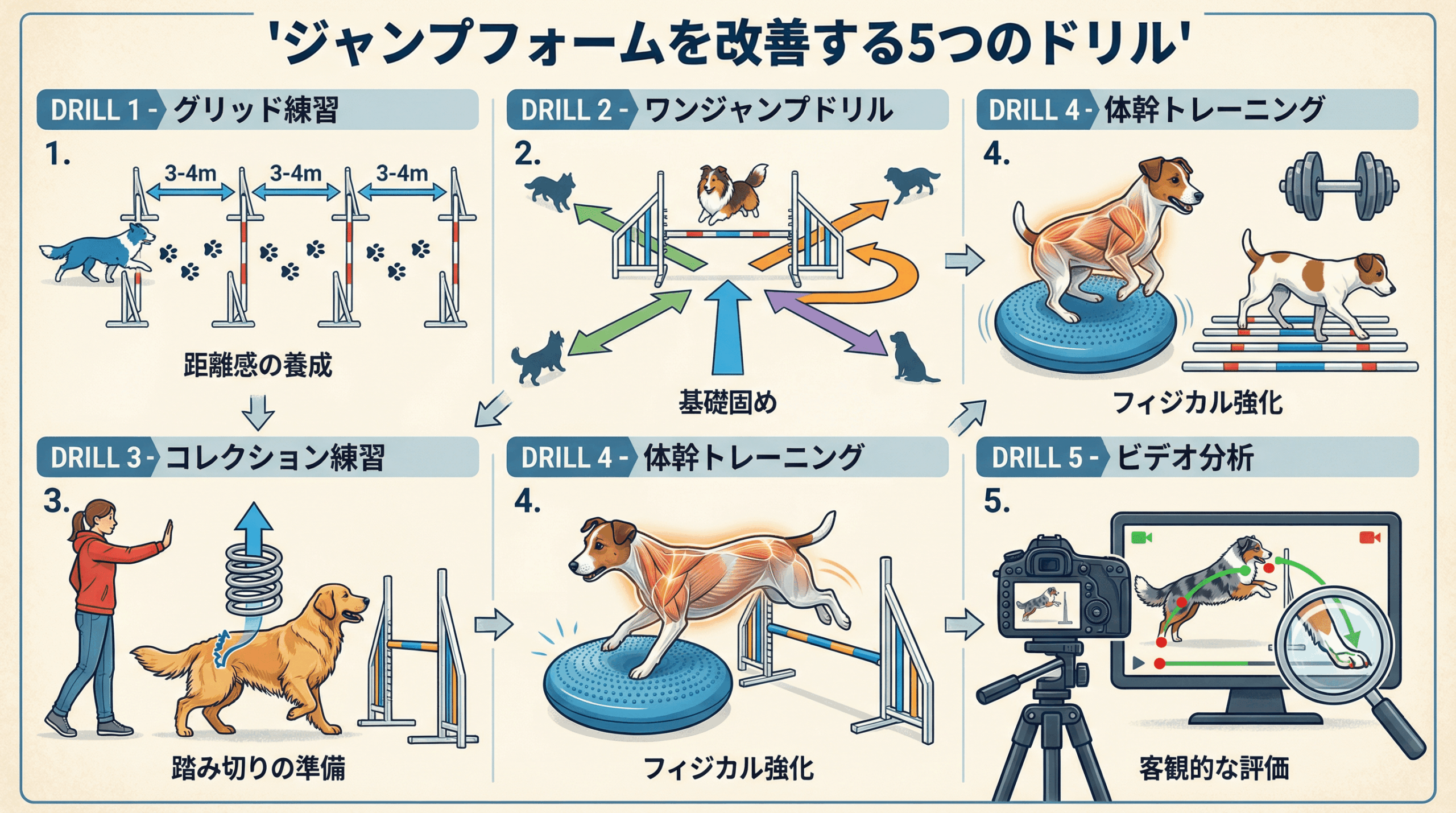 ドリル4:体幹トレーニング(フィジカル強化) バランスディスクやカバレッティなどを使い、ジャンプに必要な体幹や後ろ足の筋力を強化します。安定したジャンプフォームは、強い身体から生まれます。専門家の指導のもと、安全な方法でフィジカルトレーニングを取り入れましょう。