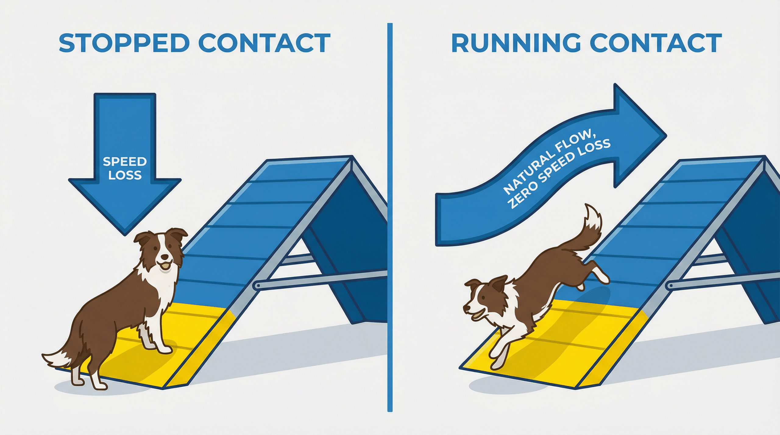 ランニングコンタクトの根底にあるのは、「犬の自然な動きを最大限に活かし、スピードのロスをゼロにする」という思想です。犬は本来、障害物を走り抜けるようにデザインされており、停止はその自然な流れを中断させます。ランニングコンタクトは、この流れを一切妨げることなく、ルール(ゾーンに触れる)をクリアすることを目指します。特に、ヨーロッパの流れるような高速コースでは、この技術が勝敗を分ける重要な要素となっています。