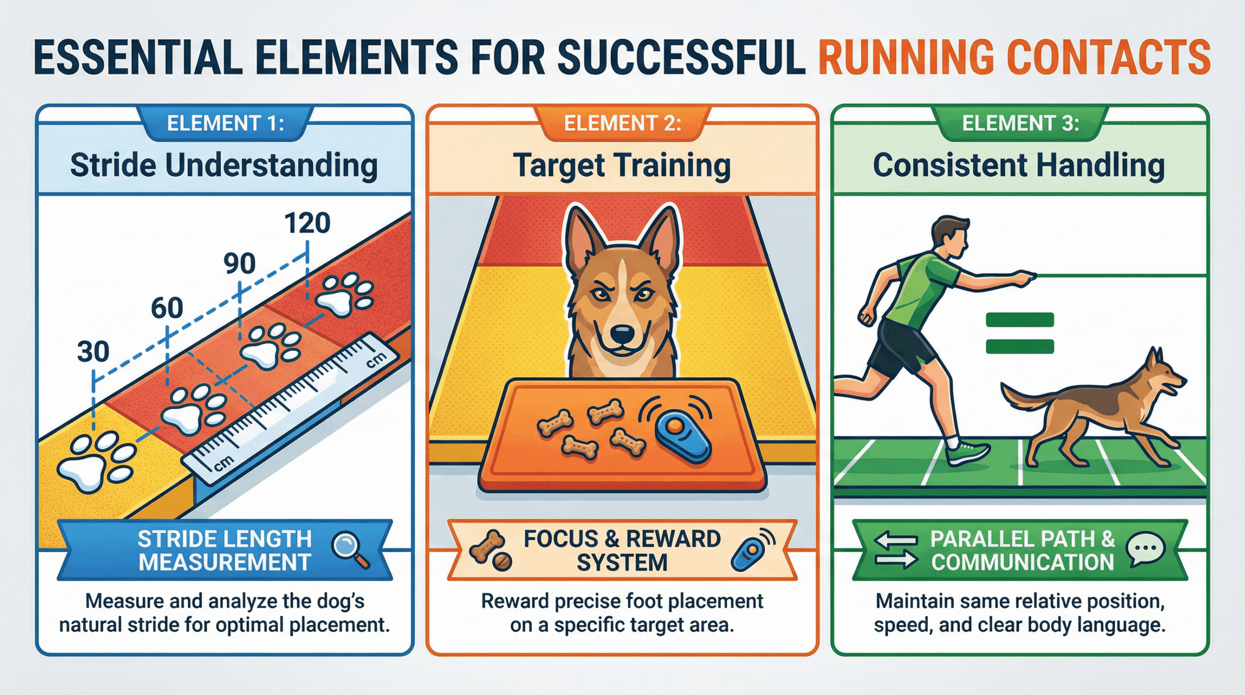 要素2:ターゲット・トレーニング 犬に、コンタクトゾーンの特定の位置(ターゲット)に足を置くことを意識させるトレーニングが不可欠です。低い板やマットを使い、そのターゲットを踏むと素晴らしい報酬が得られるという経験を何百回と繰り返すことで、犬はスピードの中でも自発的にターゲットを狙うようになります。