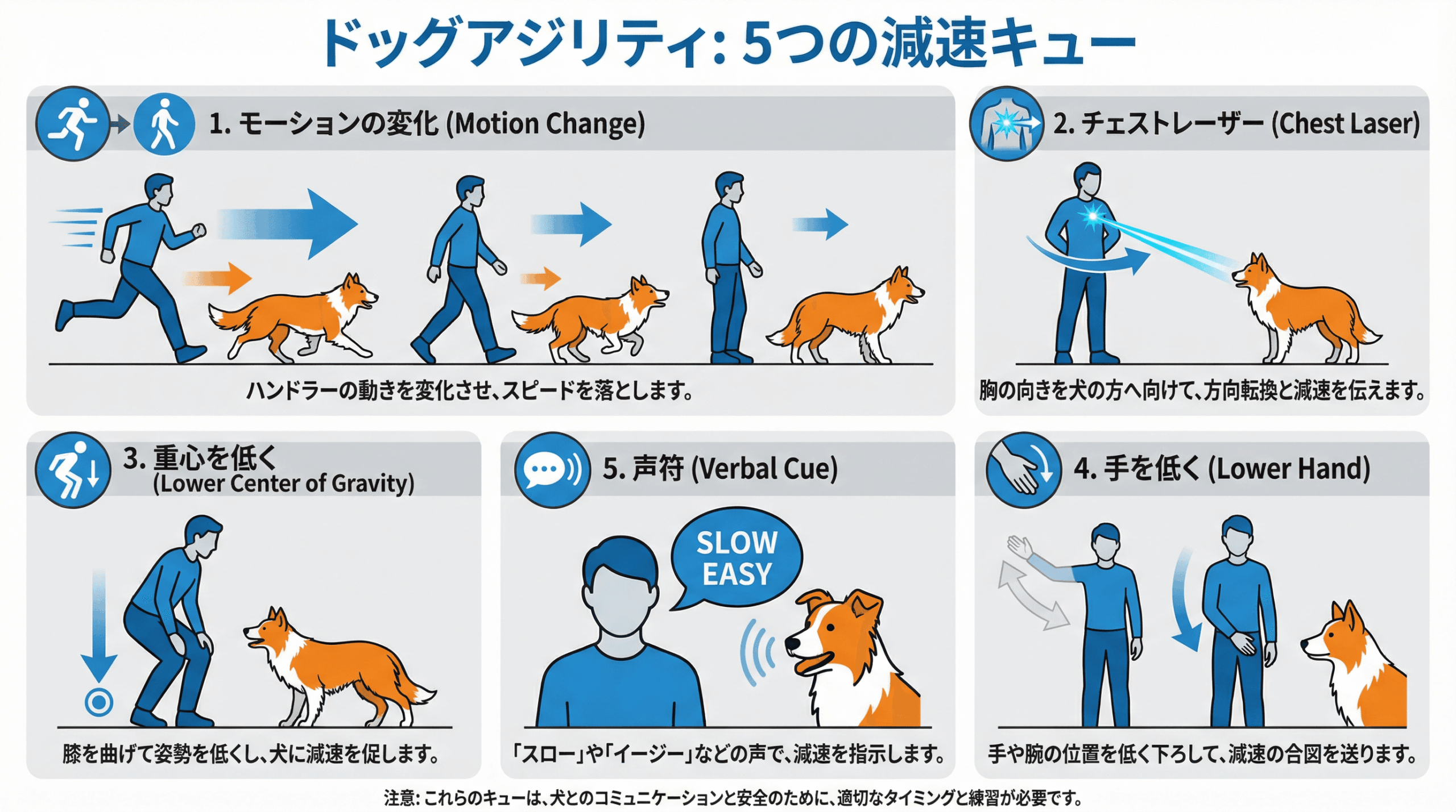 犬はハンドラーの言葉よりも、ボディランゲージを敏感に読み取ります。減速を伝えるためには、以下の5つのサインを意識的かつ明確に使うことが重要です。
