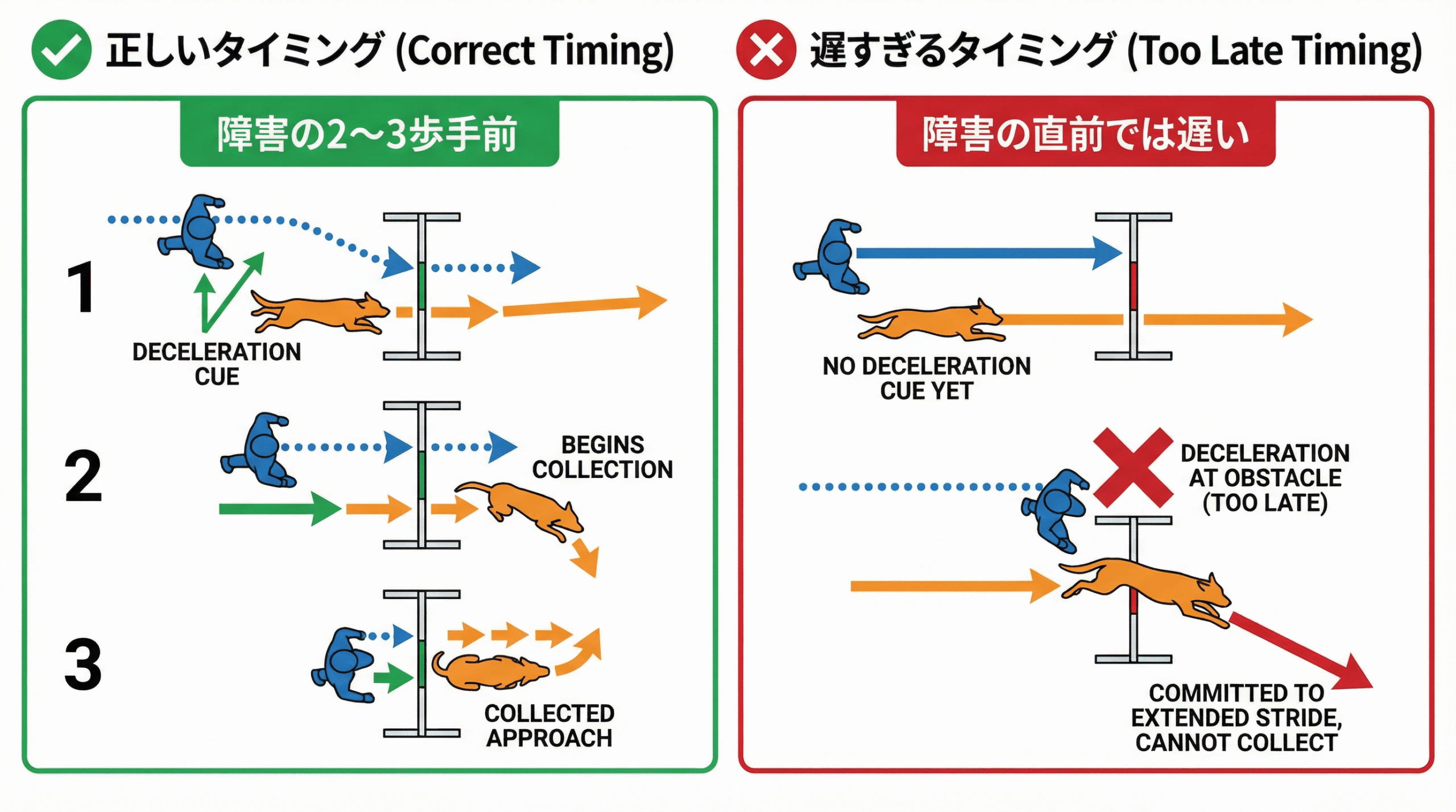減速のサインを出す上で最も重要なのがタイミングです。下の図のように、犬が障害を跳び越える直前にサインを出しても、もう手遅れです。犬は空中で向きを変えることはできません。