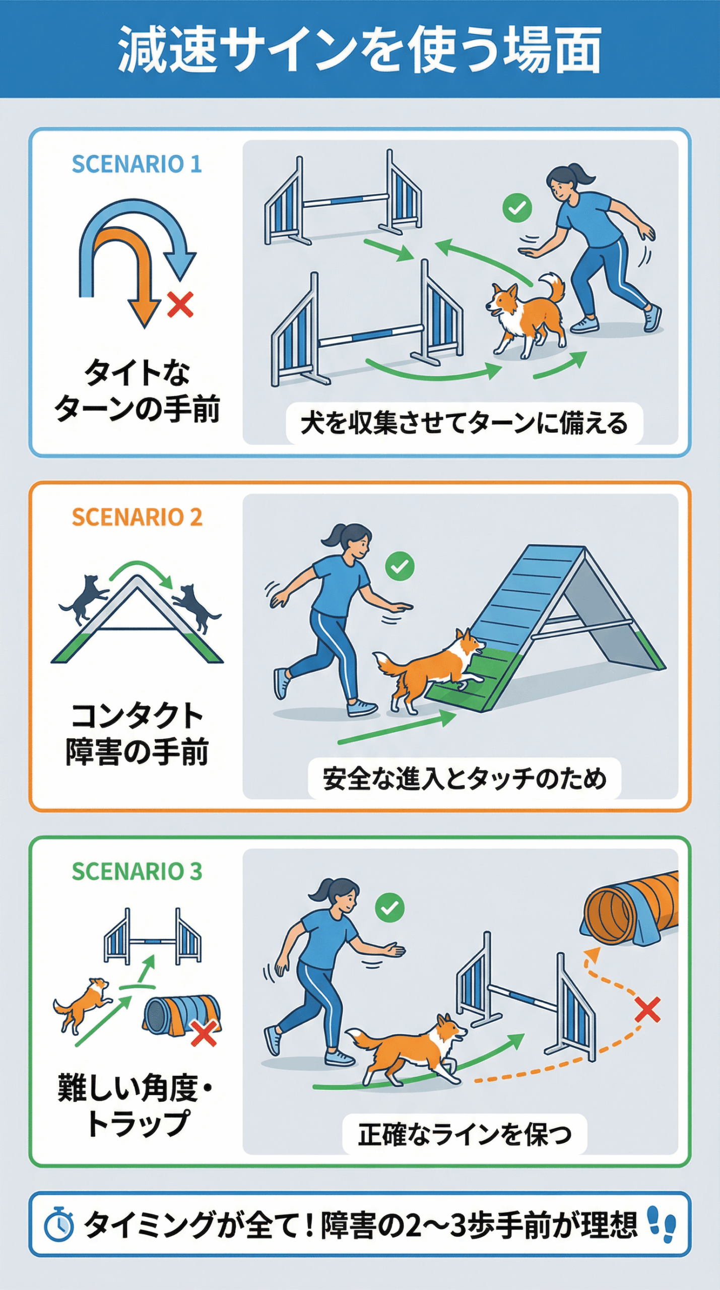 減速のサインは、犬がターンや減速の準備を始めるべき数歩手前で出す必要があります。具体的には、障害の2〜3歩手前でハンドラーが減速を開始し、犬がそのサインを読み取って、障害に進入する前には収集の状態に入れるように導くのが理想です。このタイミングを掴むことが、スムーズなハンドリングの鍵となります。