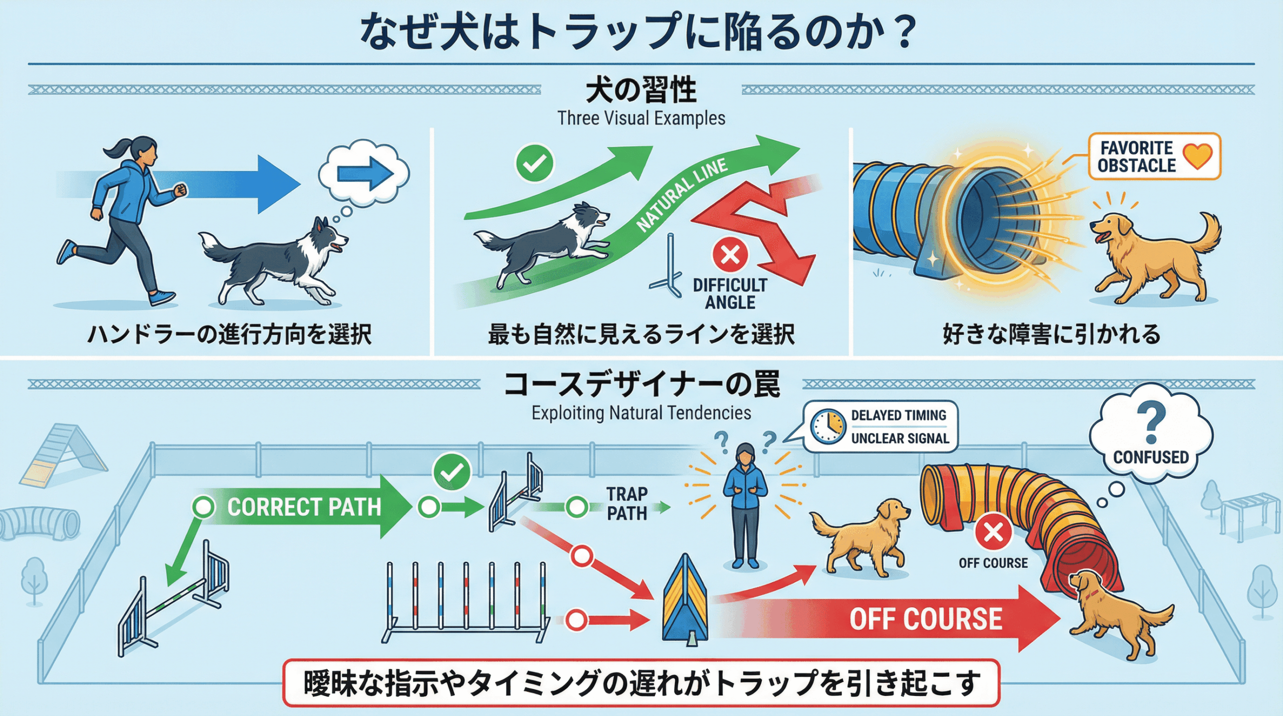 犬がトラップに陥る主な理由は、犬の習性にあります。犬は、基本的にハンドラーの進行方向や、最も自然に見えるライン(走路)を選択する傾向があります。コースデザイナーは、この習性を逆手に取り、オフコースの障害物が「正解」であるかのように見える配置を作るのです。