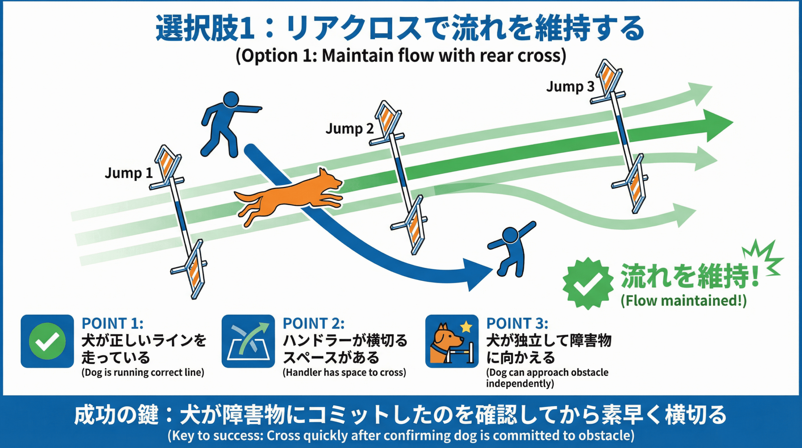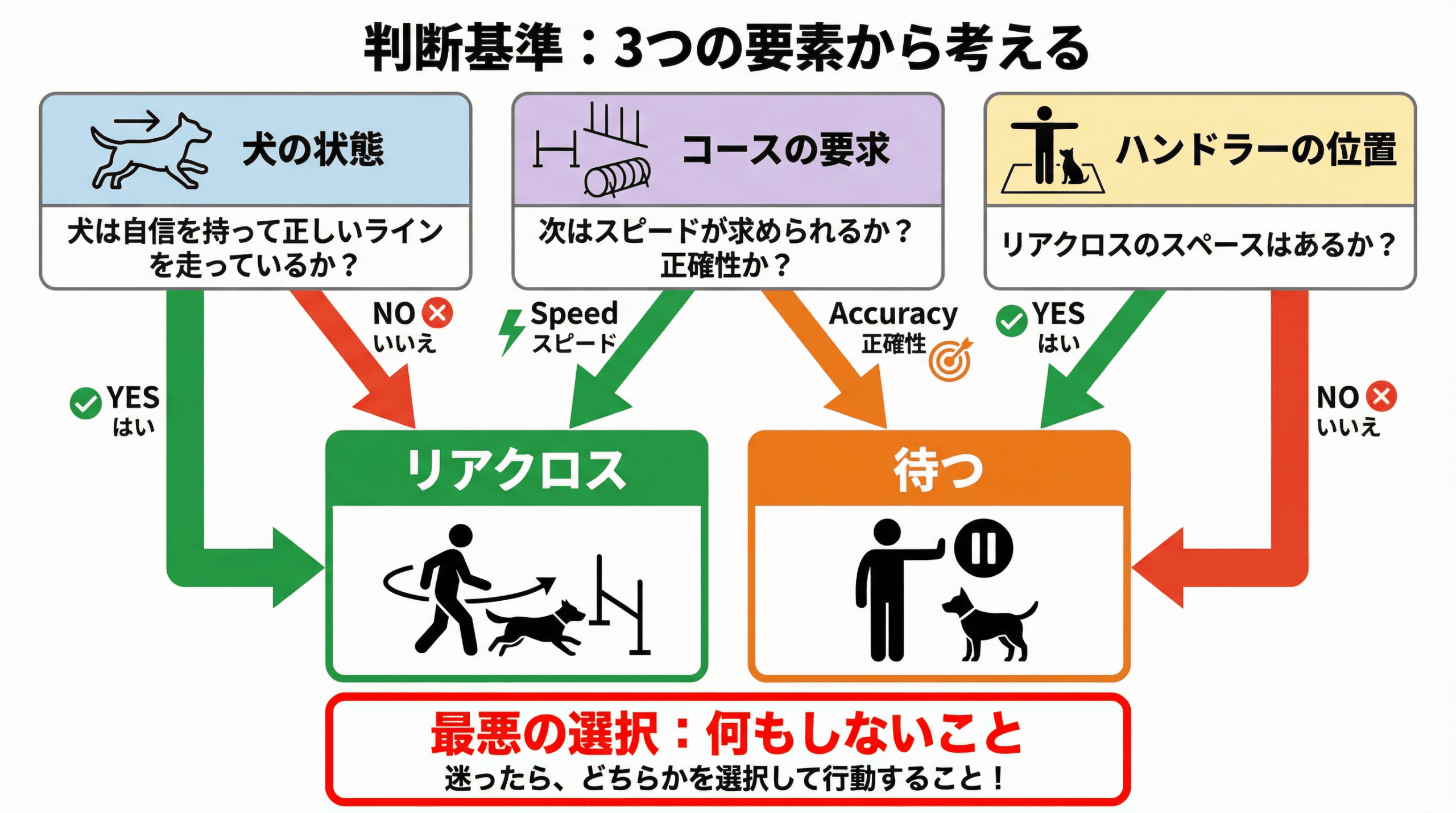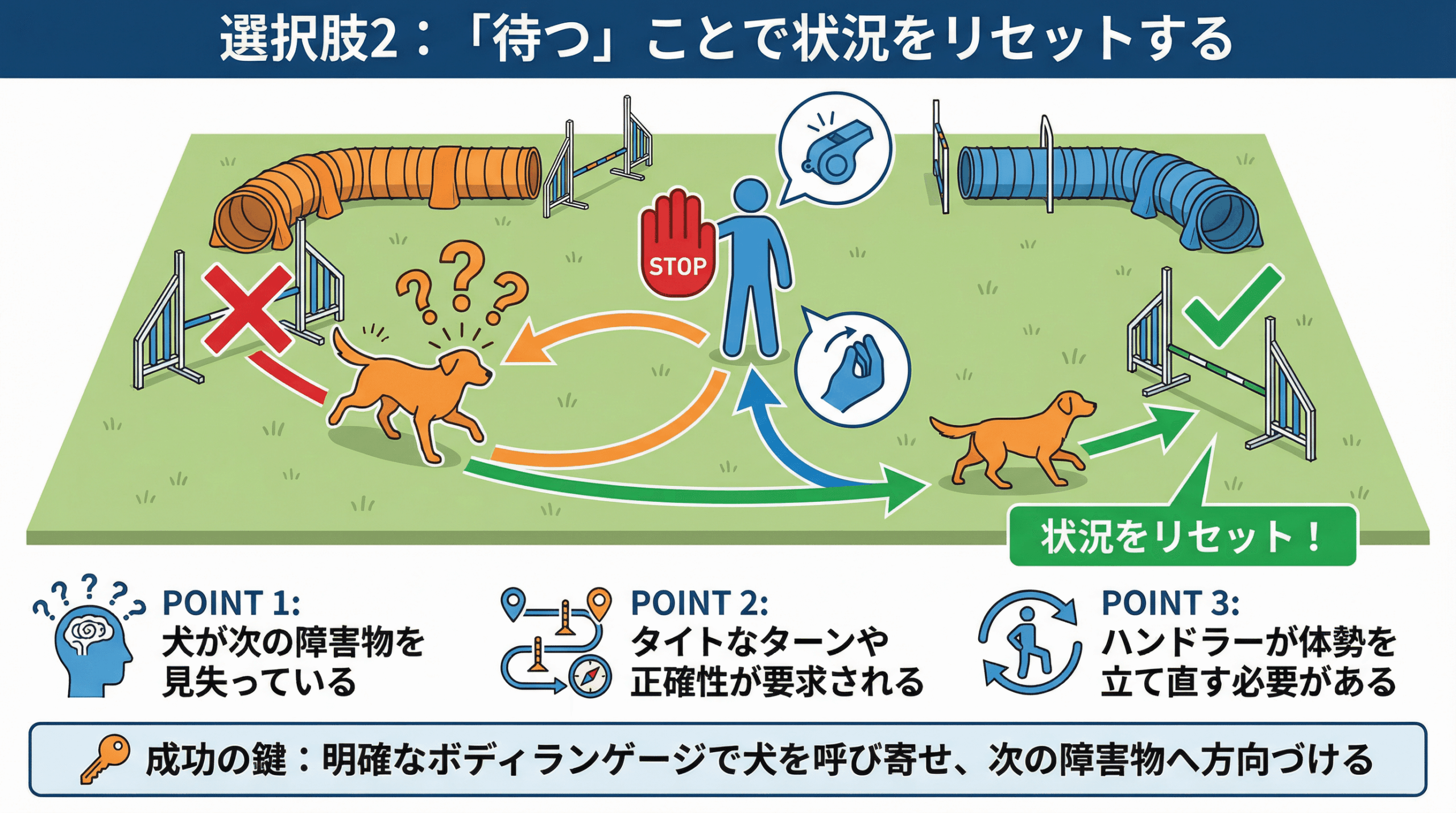 ハンドラーが遅れてしまった時、最も避けるべきは、パニックに陥り、何もしないことです。リアクロスを選択するにせよ、待つことを選択するにせよ、それは状況をコントロールしようとする積極的な意思表示です。普段の練習から、自分が遅れた状況をあえて作り出し、「クロスか、待つか」の判断を繰り返しトレーニングすることが、本番での冷静な対応力を養う鍵となります。