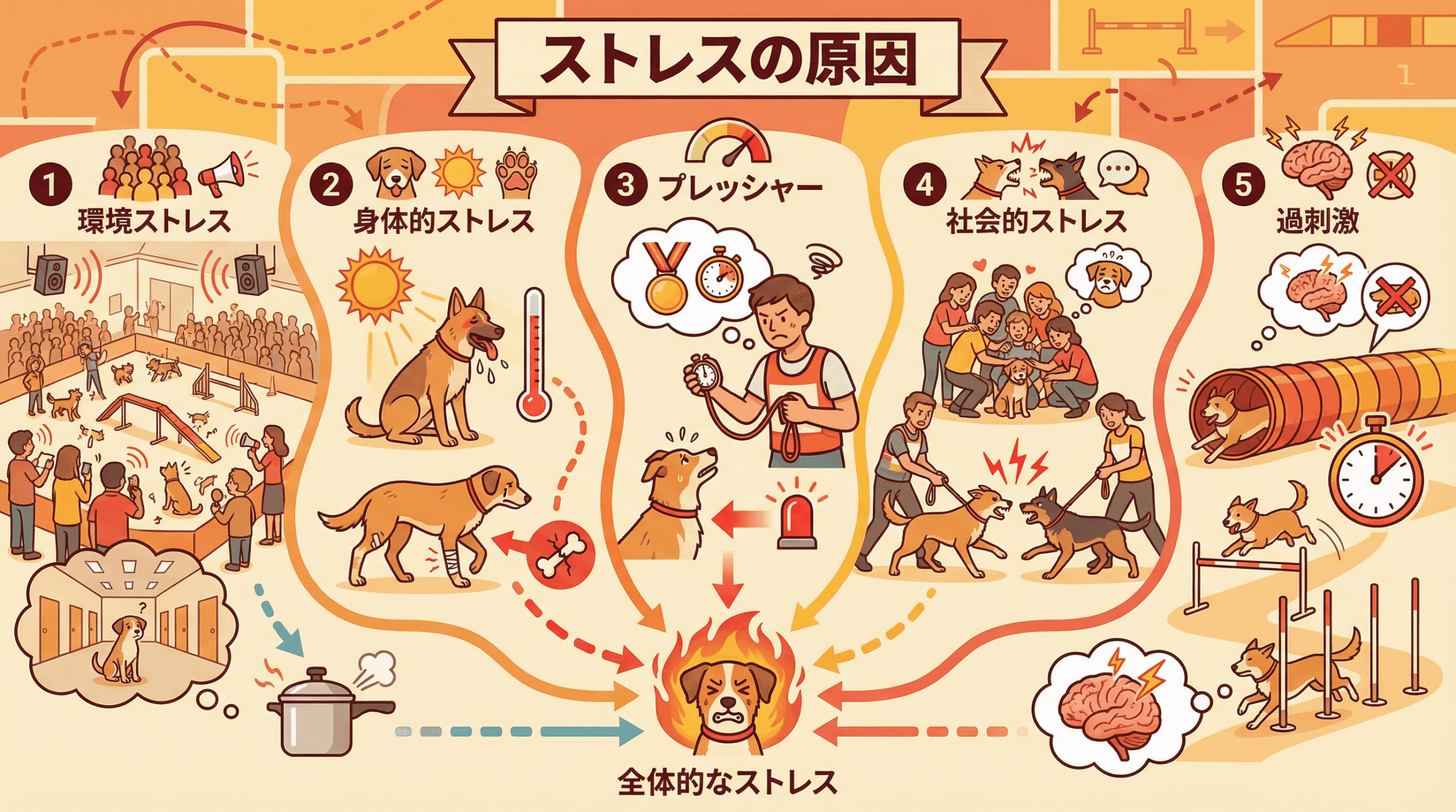 1. 環境ストレス 競技会場の騒音、多くの見知らぬ犬や人々、慣れない場所の匂いなど、五感を刺激するあらゆるものがストレッサーになり得ます。特に聴覚が敏感な犬にとって、アナウンスの音や他の犬の鳴き声は大きな負担となります。