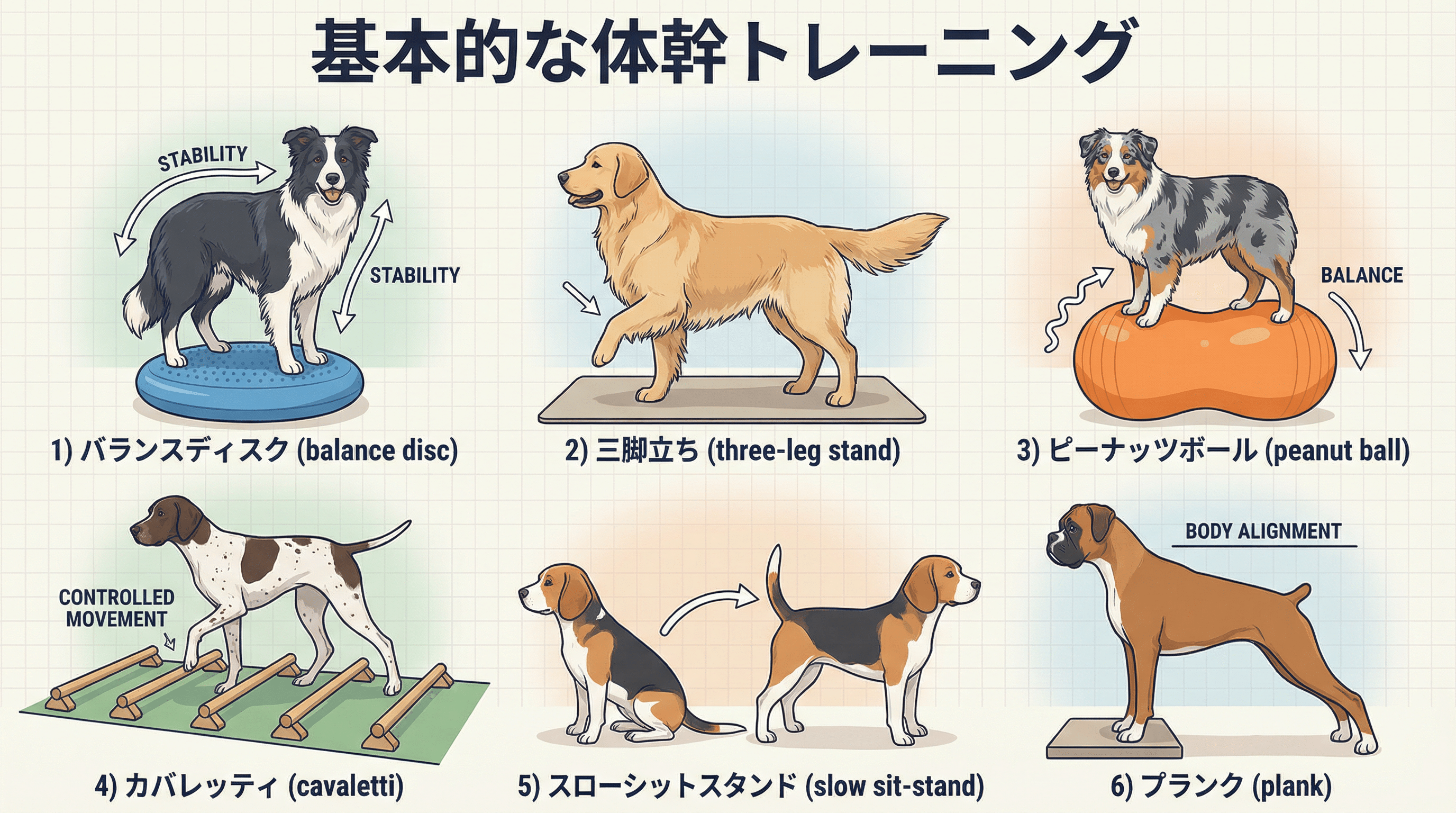 体幹トレーニングは、焦らず、段階的に進めることが成功の鍵です。常に安全を最優先し、犬が楽しんで取り組めるように配慮しましょう。