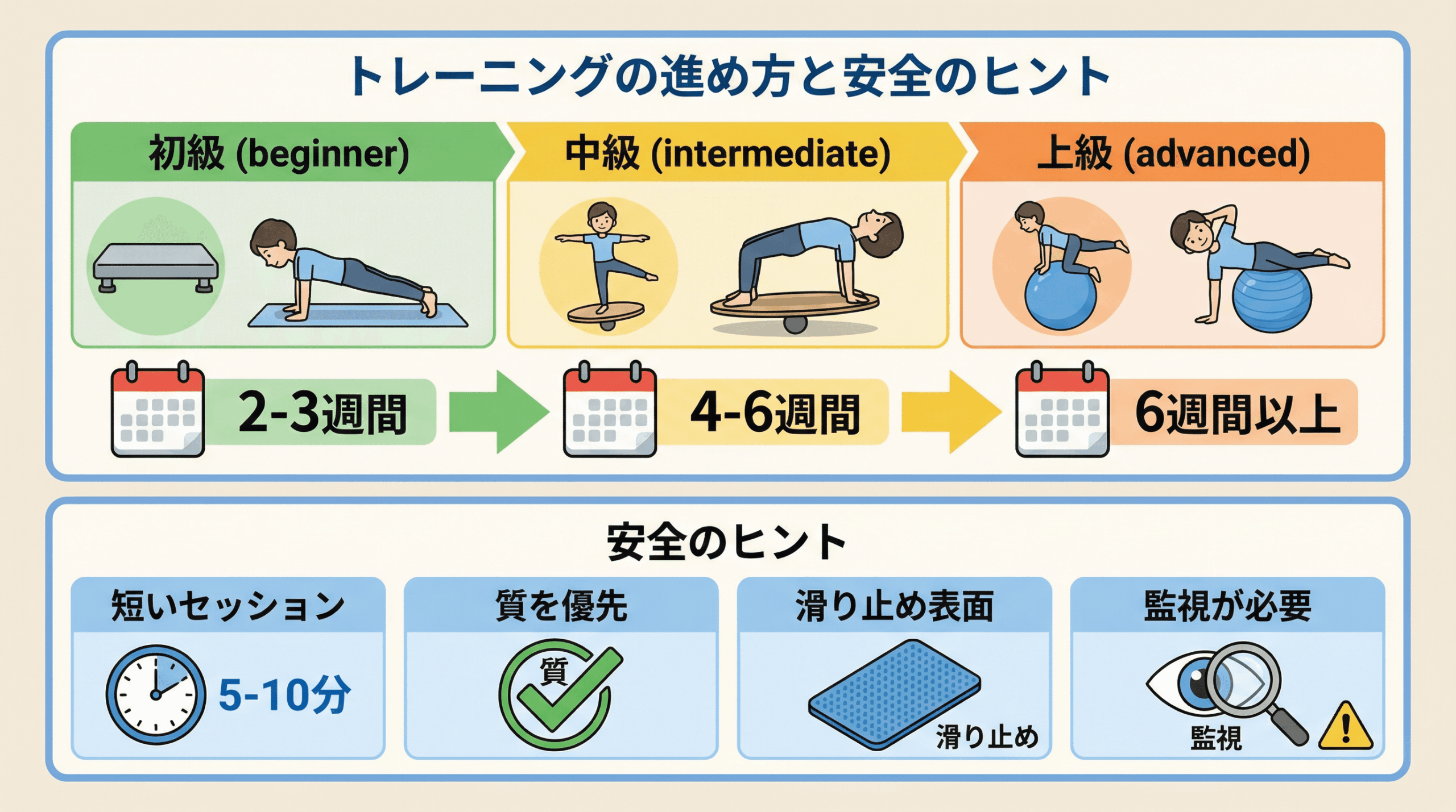 •中級(4〜6週間): バランスディスクやクッションなど、少し不安定な器具を取り入れ、バランス感覚を養います。