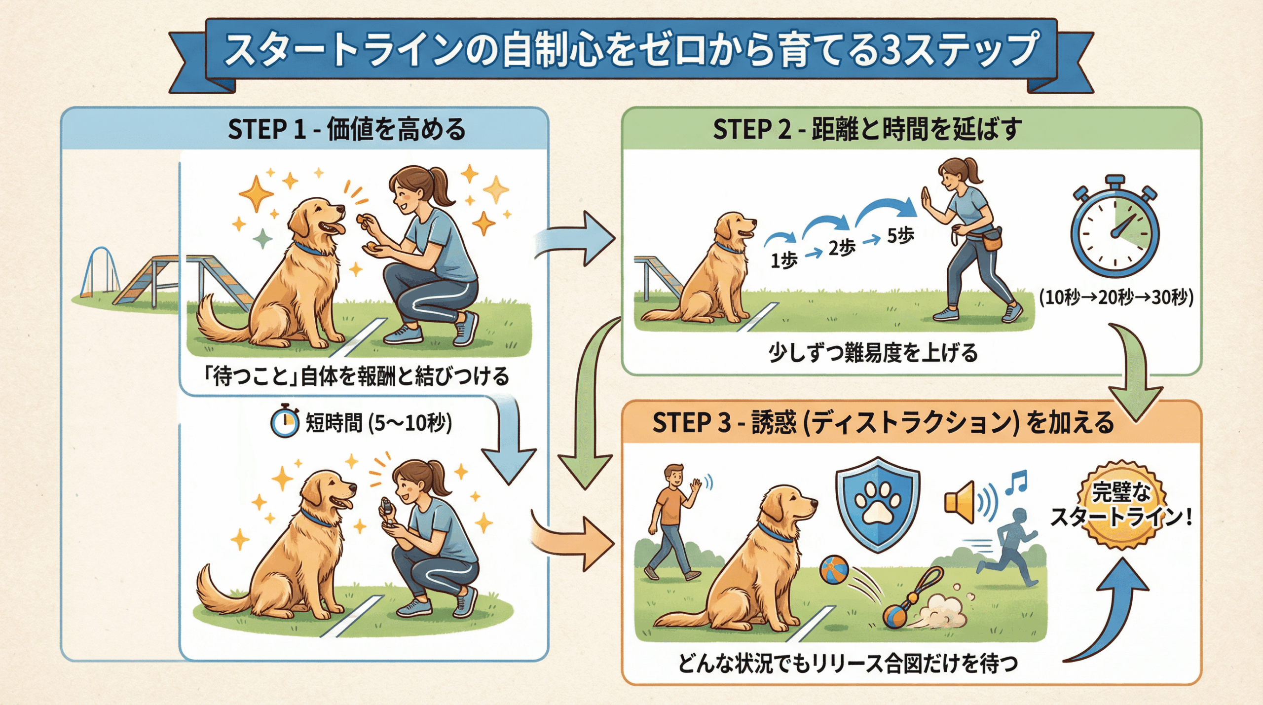 アプローチ2:報酬のパターンを変える いつもリリースして走らせることが報酬になっていませんか?時には、待てたこと自体を褒めてご褒美をあげ、そのまま練習を終了させましょう。犬に「待てば必ず走れる」と予測させないことが、自制心を維持する鍵です。