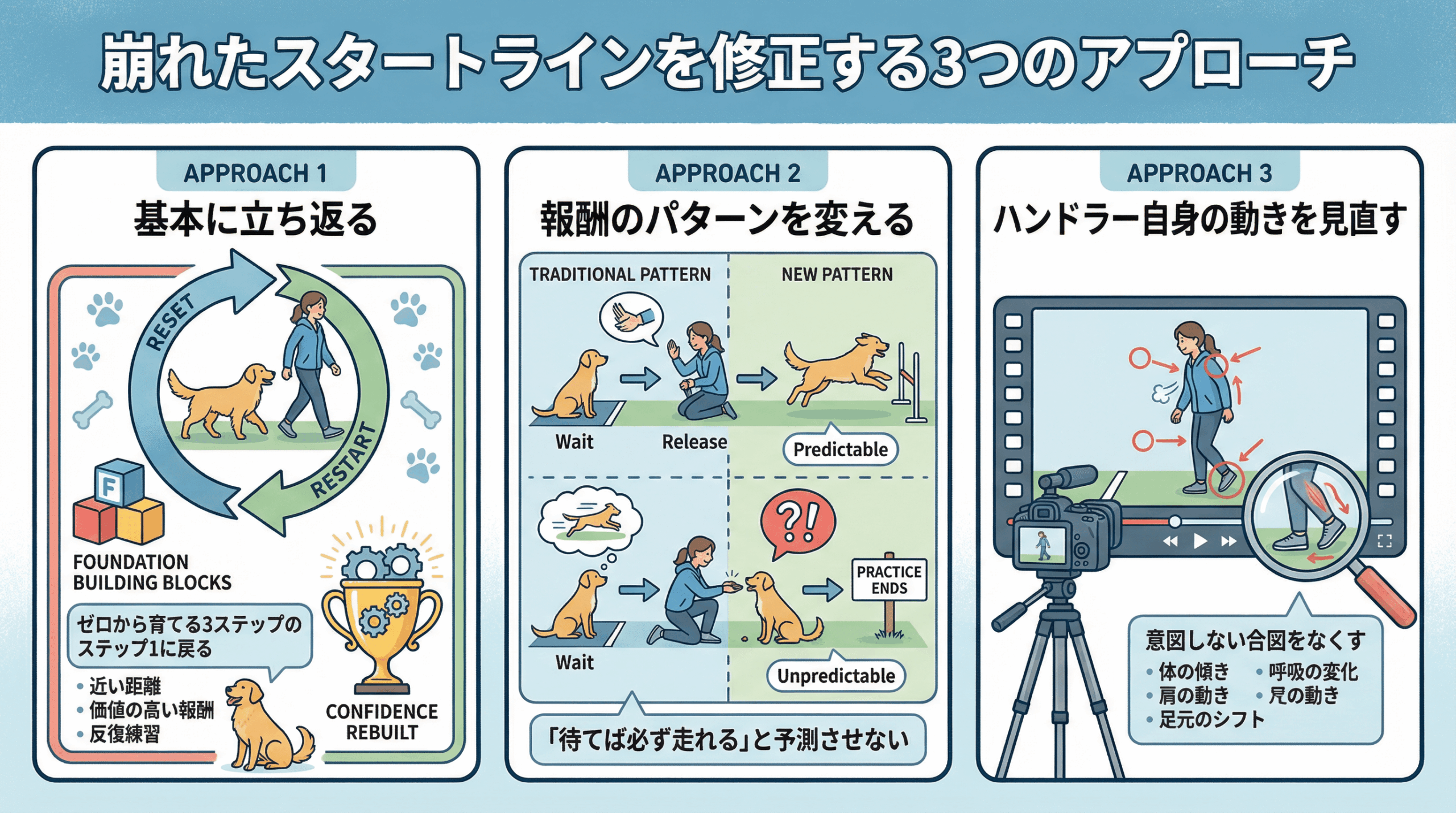 アプローチ3:ハンドラー自身の動きを見直す ハンドラーが無意識のうちに、リリース前に身体を動かしたり、息を飲んだりといった「合図」を出してしまっていることがあります。ビデオで自分の動きを確認し、犬がフライングする直前に何が起きているかを分析してみましょう。意図しない合図をなくし、リリース・キュー(解除の合図)だけを明確に伝える意識が重要です。