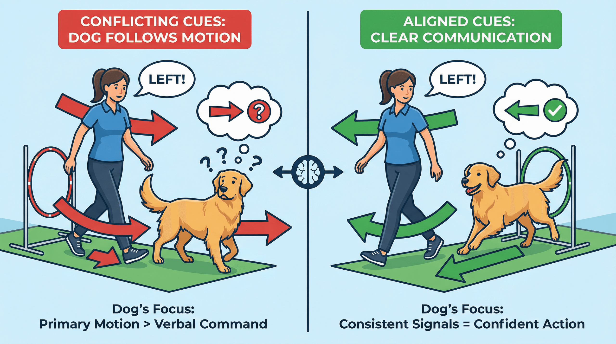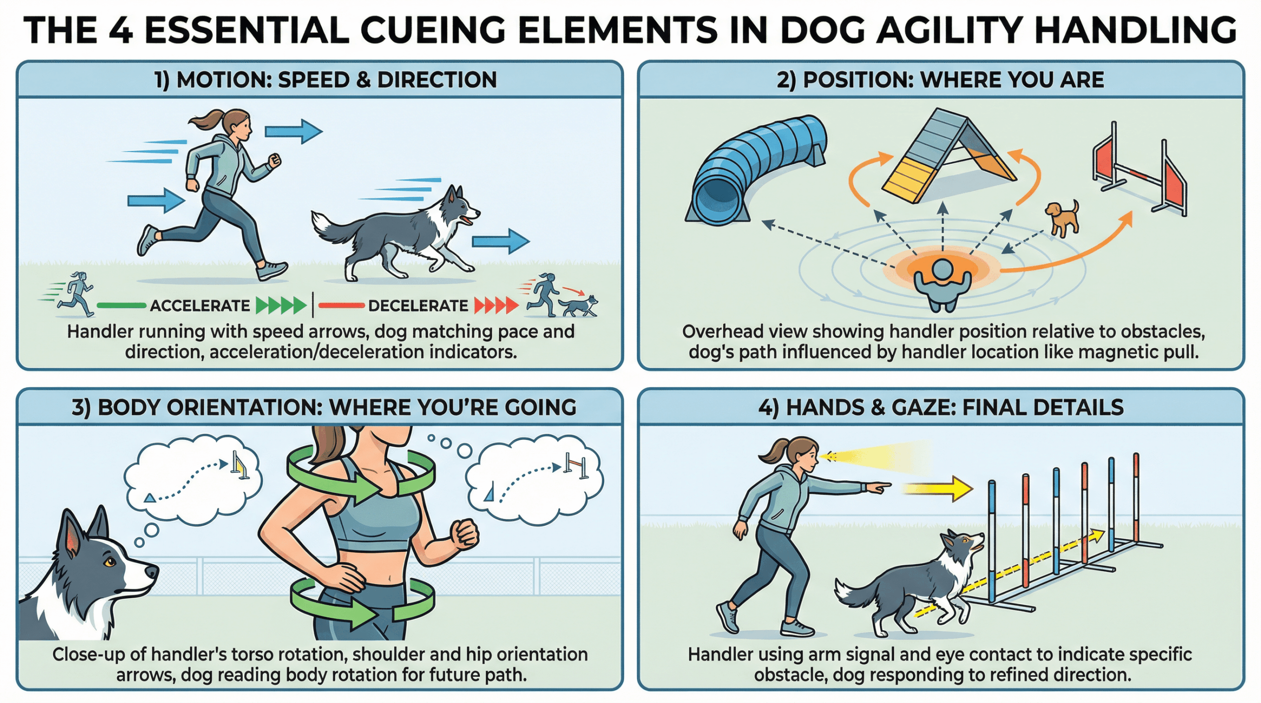今回は、犬がどのようにハンドラーのキューを解釈しているのか、その視点から、効果的なコミュニケーションの根幹をなす4つの要素(モーション、ポジション、肩と腰、手と視線)について解説します。これらを理解することは、コース上でのミスを減らし、よりスムーズで速いパフォーマンスへの扉を開くでしょう。