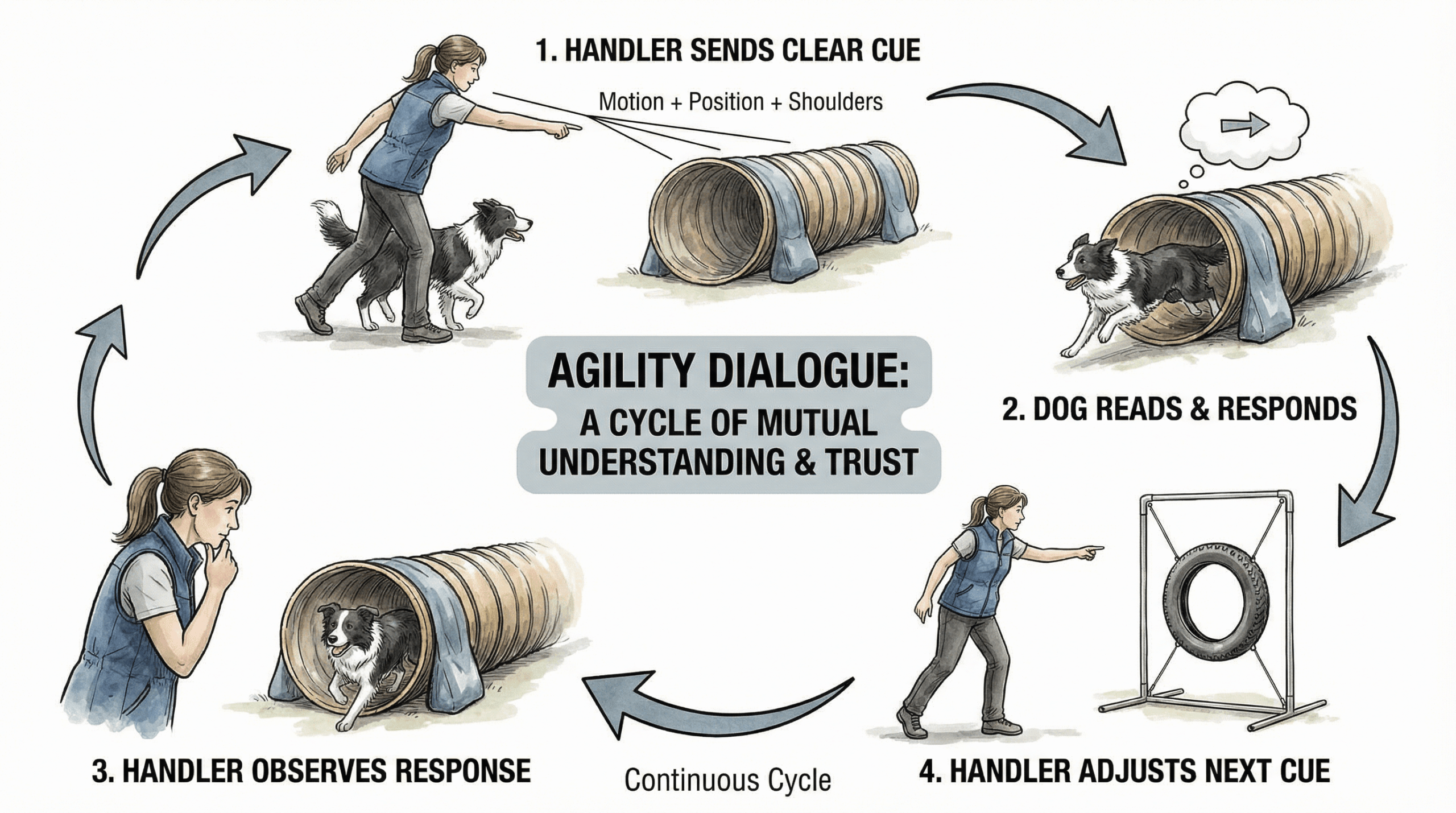 効果的なハンドリングとは、ハンドラーから犬への一方的な「命令」ではありません。それは、体の動きを共通言語とした、絶え間ない「対話」です。ハンドラーが明確なキューを送り、犬がそれを正確に読み取って反応し、その犬の動きを見てハンドラーが次のキューを送る。このスムーズなコミュニケーションの連鎖が、美しいアジリティパフォーマンスを生み出します。